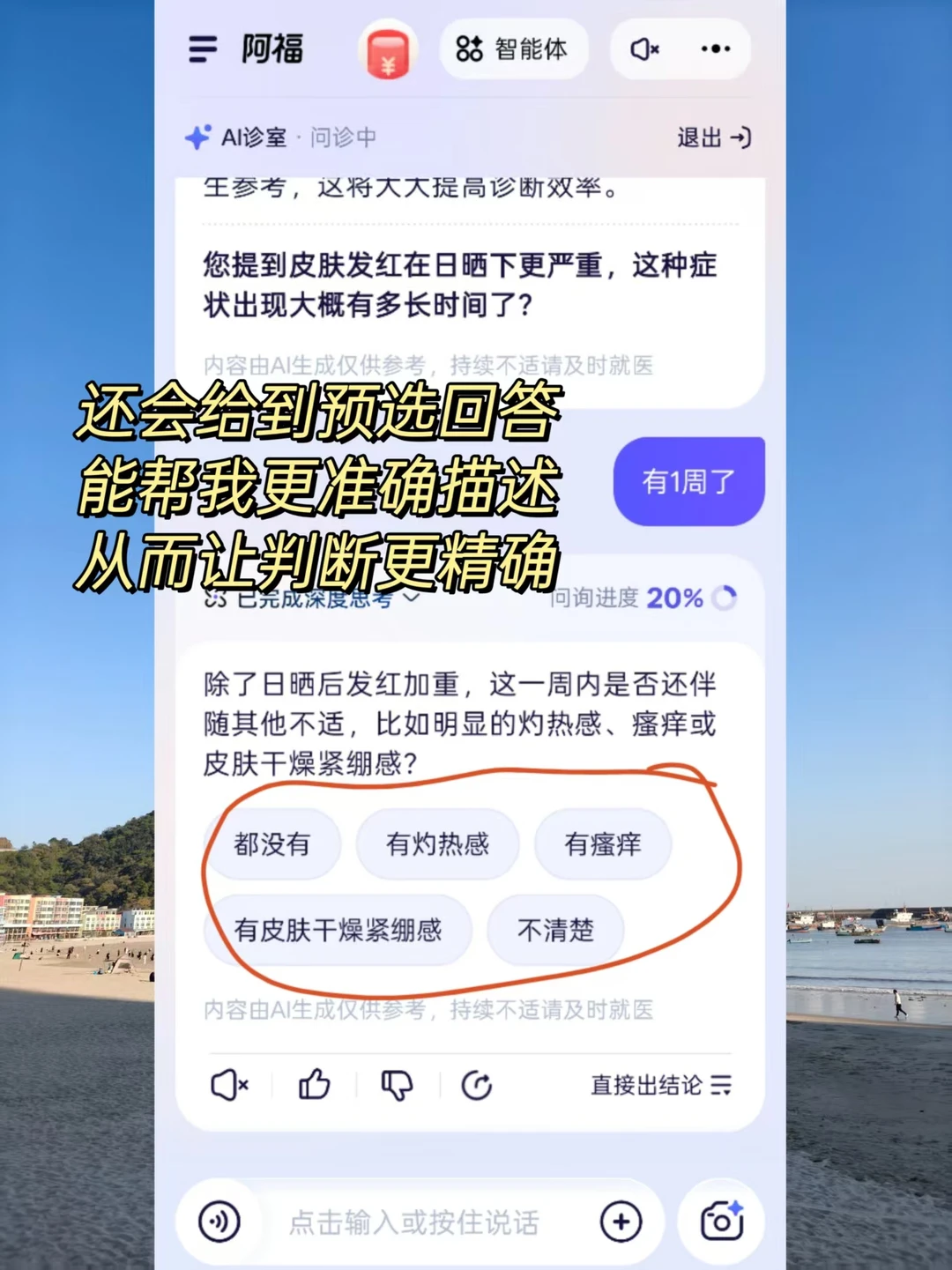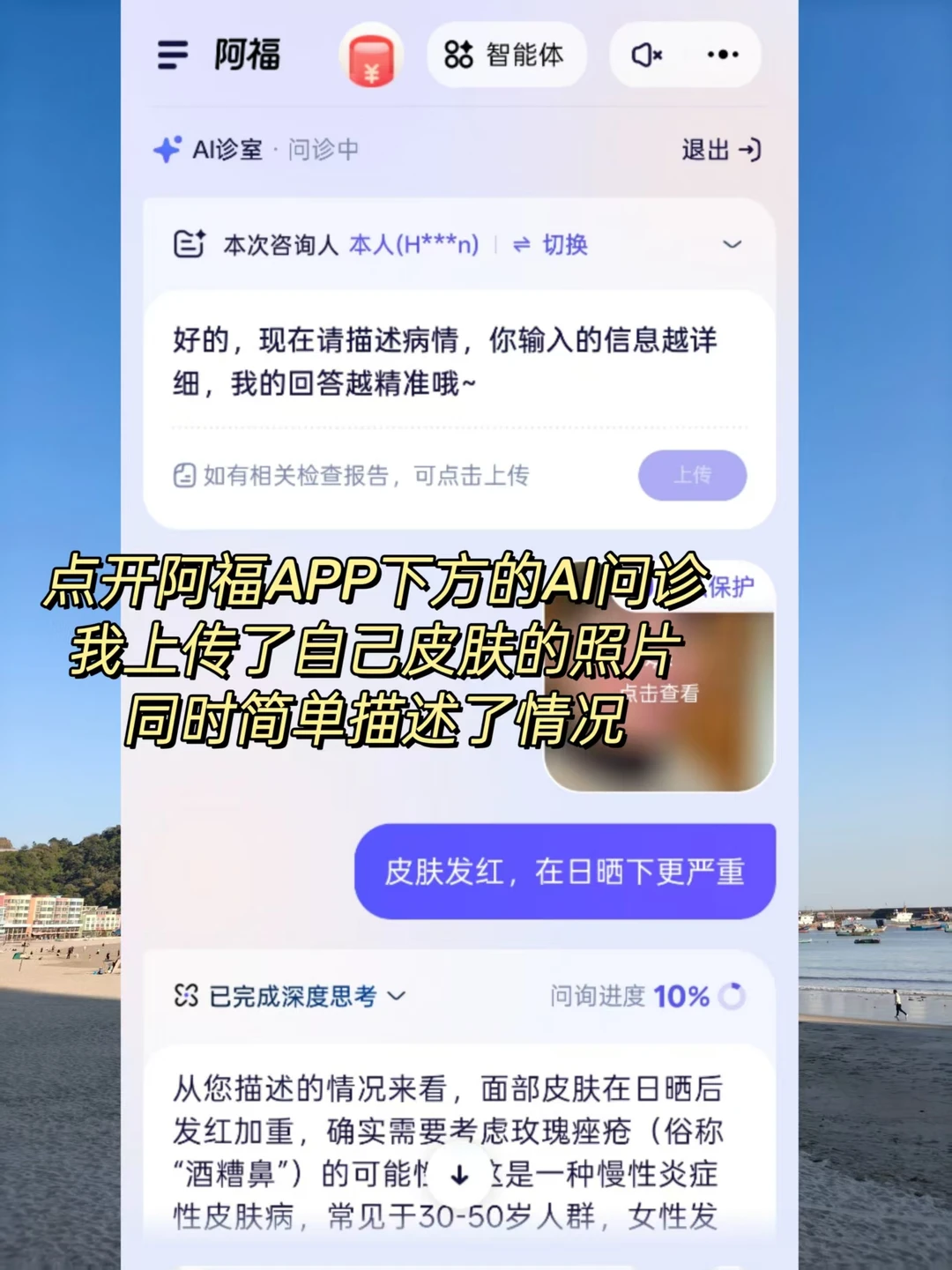 像是最近我皮肤频频发红、干燥紧绷,日晒后更严重,不知道是普通敏感还是缺水,一顿猛护肤也不见效,我就用阿福的 AI 诊室咨询,它真的像真人医生一样开始追问细节:“最近一次发作在什么环境下?”“平时的护肤流程具体是什么?”“不适感是持续的还是阵发的?”甚至问到“你有没有在喝咖啡?”这种细节。我被这种抽丝剥茧的问询方式戳中了,感觉它真的在思考,而不是机械回复,最后引导我直接拍皮肤,照搬后阿福是玫瑰痤疮。根据我的情况,阿福给出了超实用的避坑建议:千万别用含酒精、香精的护肤品,也别过度清洁,之前我就是因为频繁去角质才加重了症状。