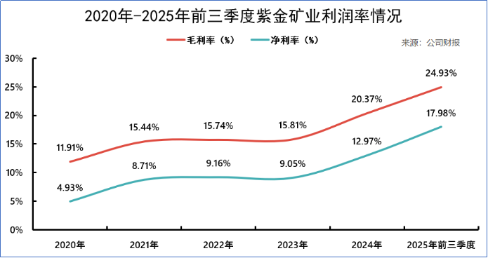 近年来,紫金矿业利润率稳步上升:毛利率从2020年的11.91%增至2025年前三季度的24.93%,净利率也相应地从4.93%增至17.98%。