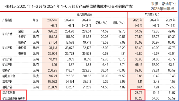 从2025年半年报中不难看出,紫金矿业不同业务之间毛利率差距十分明显。