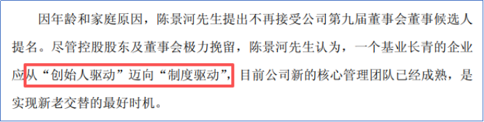 他认为,一个基业长青的企业应从“创始人驱动”迈向“制度驱动”,目前公司新的核心管理团队已经成熟,是实现新老交替的最好时机。
