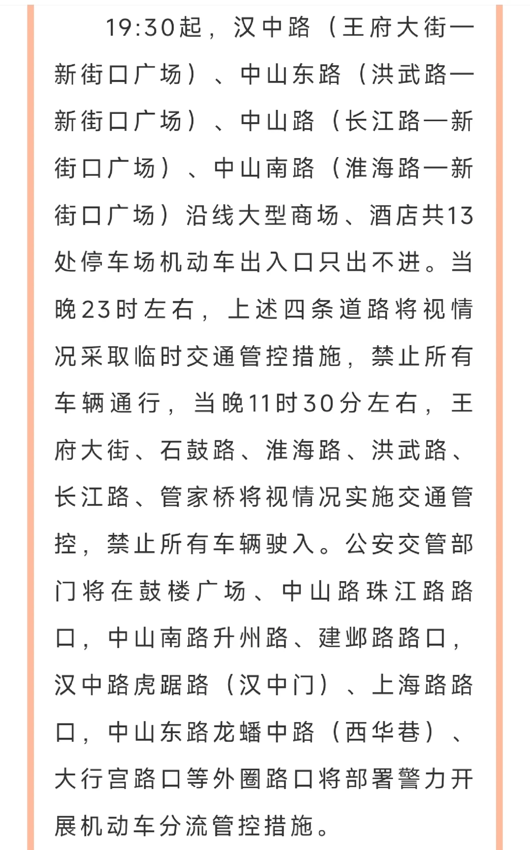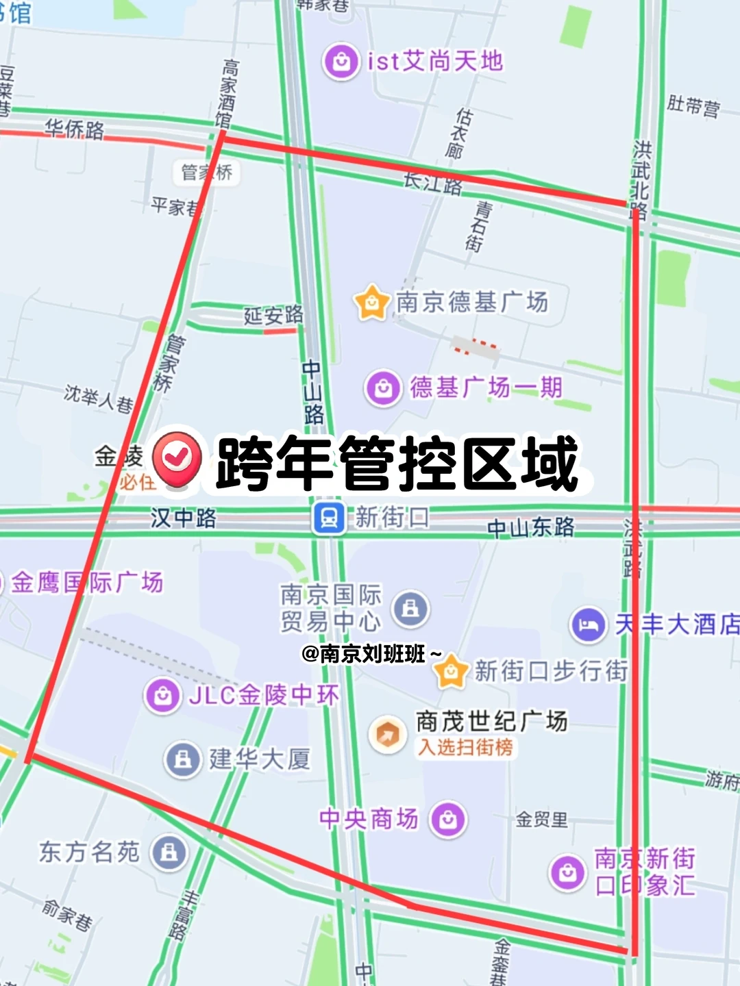 👣管控区域:新街口“四环路”以内,即:华侨路—长江路—洪武北路—洪武路—淮海路—石鼓路—王府大街—管家桥合围范围(含路面)