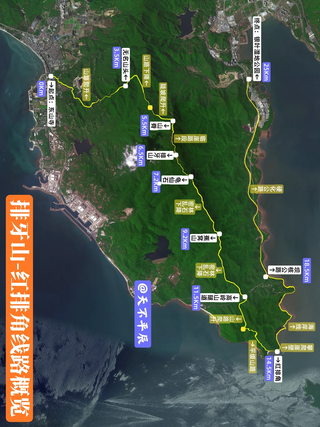 ❷行程:东山寺19m→无名山头465m→山脊633m→排牙山718m→龟仙石695m→蕉窝山358m→红排角1m→坝核公路10m→坝光银叶湿地公园3m