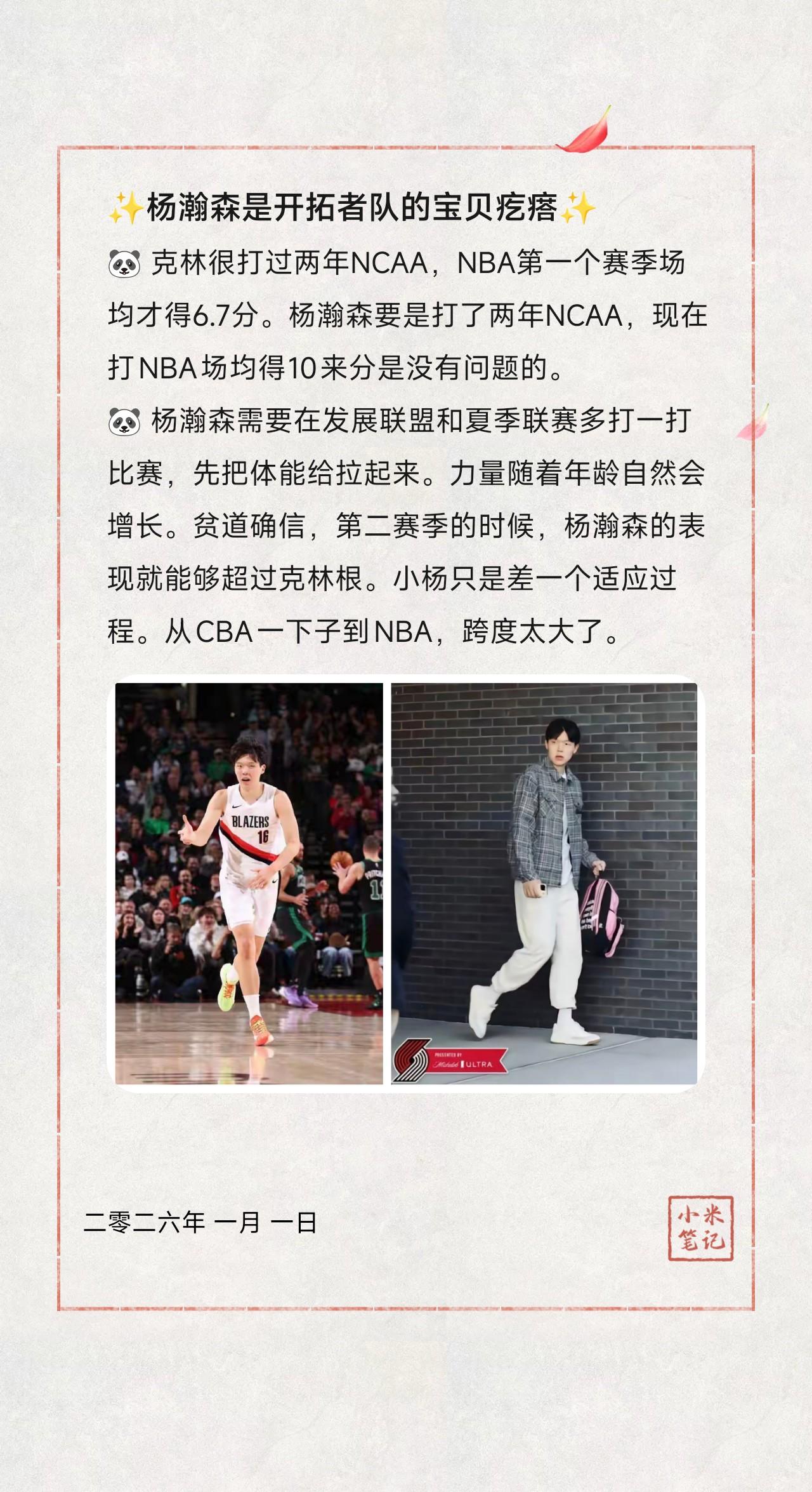 🐼 克林很打过两年NCAA,NBA第一个赛季场均才得6.7分。杨瀚森要是打了两年NCAA,现在打NBA场均得10来分是没有问题的。 🐼 杨瀚森需要在发展联盟和夏季联赛多打一打比赛,先把体能给拉起来。力量随着年龄自然会增长。贫道确信,第二赛季的时候,杨瀚森的表现就能够超过克林根。小杨只是差一个适应过程。从CBA一下子到NBA,跨度太大了。 作者:龙须面🧐