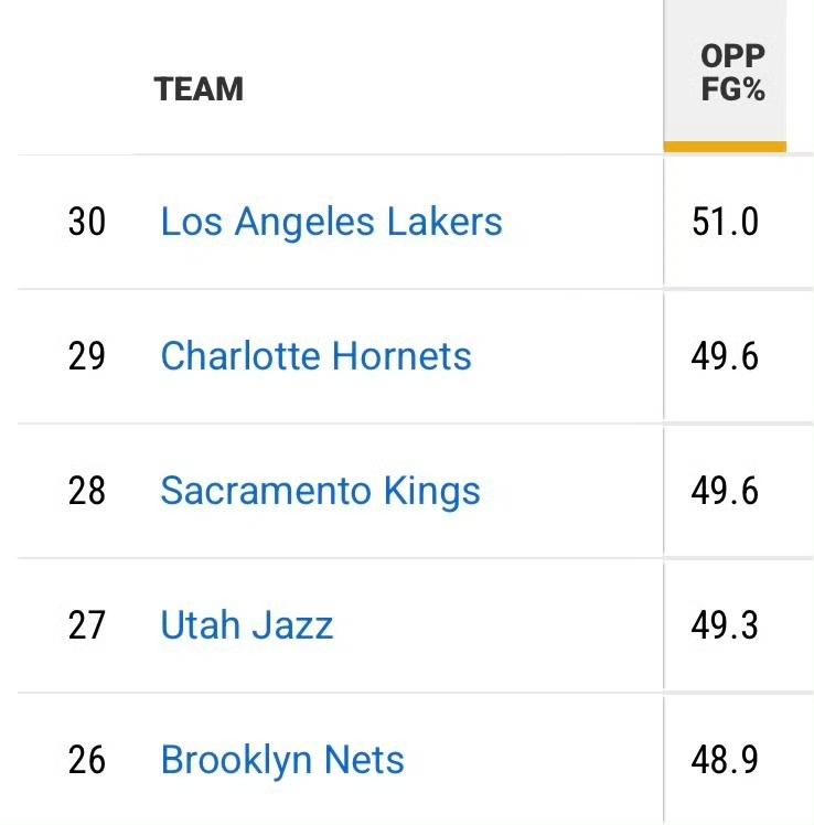 赛季至今,湖人在主场让对方投出了联盟最高的51%投篮命中率……此外,湖人的替补球员场均得分联盟最少,替补球员场均上场时间是联盟第二少……湖人 nba 湖人