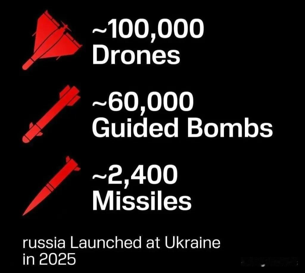 乌克兰对俄罗斯军队2025年空袭乌克兰做了个总结。(图一)是2025年乌克兰每个州空袭警报的次数,(图二)是空袭武器的数量,其中自杀式无人机约10万架,制导/滑翔航弹约6万枚, 各式弹道弹/巡航弹约2400枚。