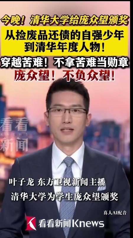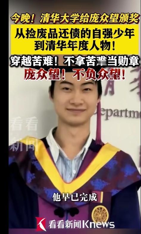 从捡废品少年到清华年度人物!庞众望,真的不负众望! 八年前,河北吴桥的破旧瓦房里,少年庞众望啃着馒头、捡废品凑学费,母亲双腿残疾、父亲精神分裂,家徒四壁的日子里,他攥着684分的高考成绩,把清华录取通知书捧回了家。 八年后,清华大学的颁奖舞台上,聚光灯打在他身上——精密仪器系博士、“清华年度人物”。这个从泥泞里爬出来的小伙,把“不负众望”刻进了人生。 2025年这场颁奖,让全网重新记起这个苦孩子。曾经“寒门贵子”的标签,如今看来轻飘飘的,撑不起他走过的路。 当年记者问他“日子苦不苦”,他挠挠头说“就生活有点难”,还笑着说“我妈那么好,我的家庭没什么不能说的”。 最难的时候,他一边照顾病重父母,一边打零工、捡废品还债凑学费,可课堂上的他,眼里永远亮着不服输的光。 进了清华,别人都以为他会一头扎进实验室甩开苦日子,他却偏往山区跑——支教、做科普,还一次次回吴桥老家,想让更多孩子知道“读书能改命”。 他说从不是“苦难的英雄”,只是想“把自己淋过的雨,变成给别人撑的伞”。 这世上总有人生在泥泞,却活成灯塔。庞众望的故事从不是偶然,是他把每一次难都熬成向上的台阶。在苦日子里仰望星空,站在高处又搭梯子拉人一把,这才是真正的强大。 如今的他,是清华的博士,是山区孩子的老师,更是普通人的榜样。他用人生证明:命运给的烂牌,靠自己也能打出王炸。只要心里有光,脚下就总有路。 大家觉得呢?欢迎大家评论区讨论留言。