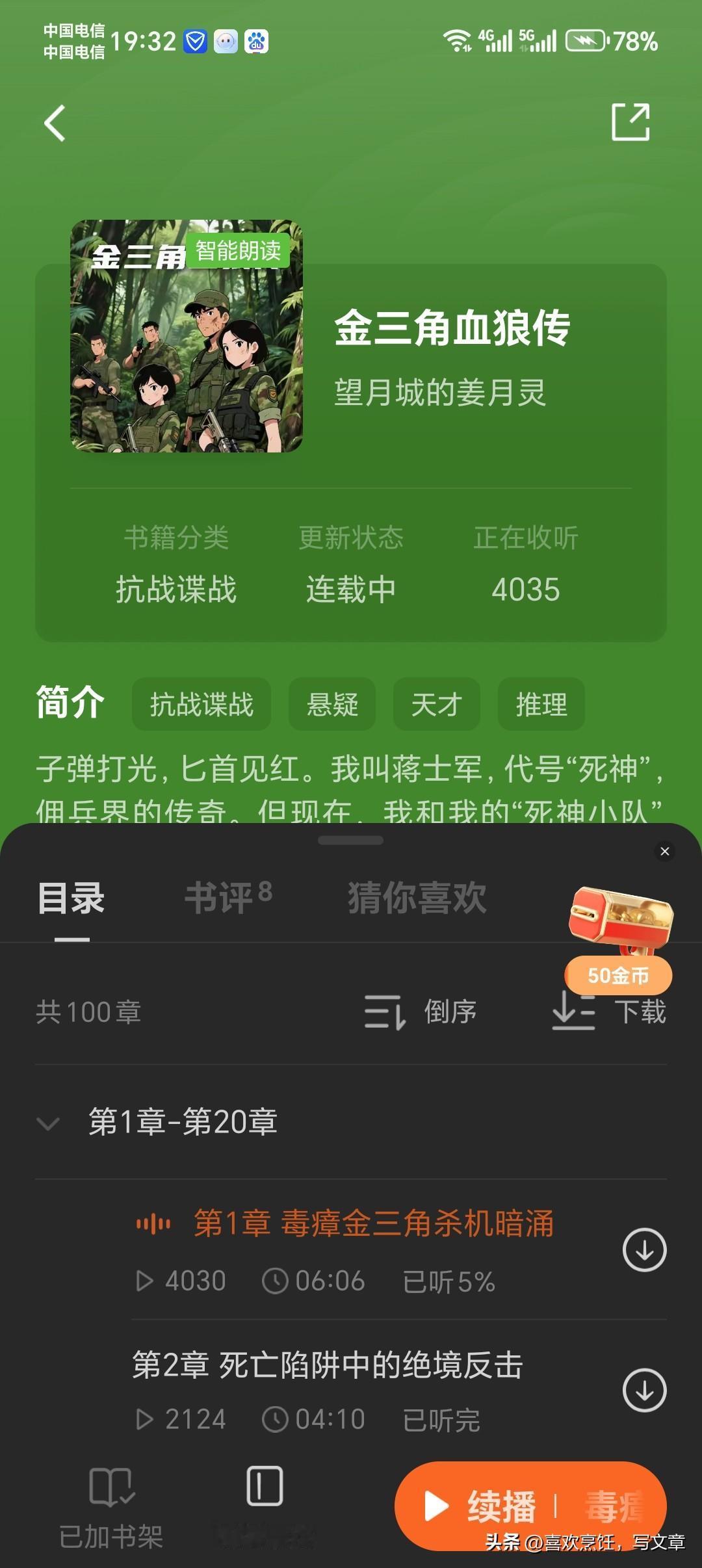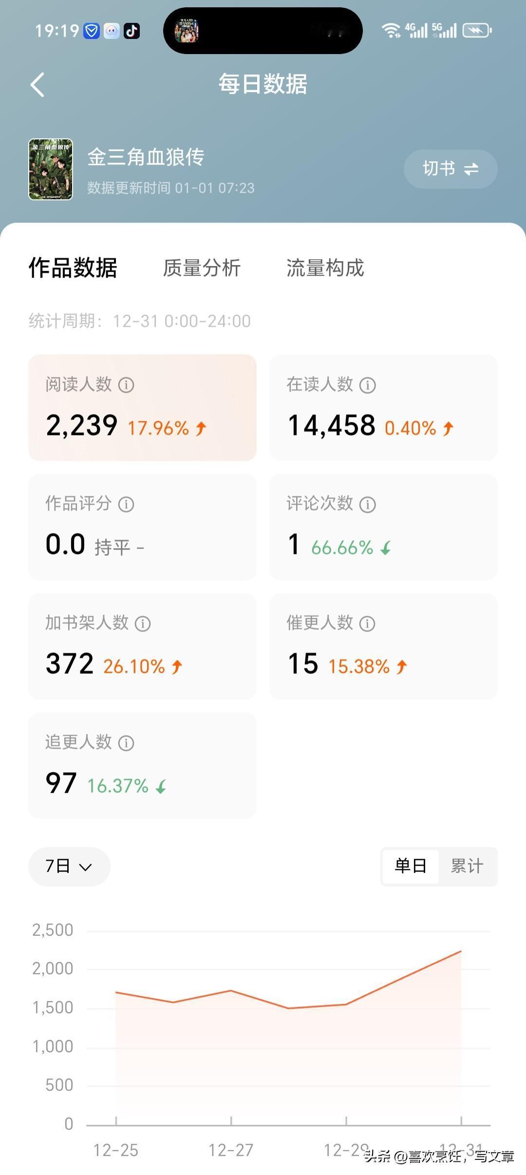 给今日头条的书友们晒一波我的创作战绩!仅用20天,《金三角血狼传》就从0阅读一路逆袭,数据亮眼到爆,全勤奖稳拿哦👇 ✅ 收益狂飙:累计收益545.47元(逼近550元大关),12月31日单日收益38.2元,阅读收益33.08元+听书收益5.12元双渠道齐飞; ✅ 人气爆棚:《金三角血狼传》连载至54.1万字,在读人数14458人,单日阅读人数2239人,环比暴涨17.96%! 四本大篇幅力作,本本都是诚意满满: 1. 《金三角血狼传》:金三角佣兵硬核搏杀名场面扎堆,500章、350万字打底,每一场战斗都透着真实的硝烟味; 2. 《蒋士军之亚马逊巅峰佣兵传说》:亚马逊雨林绝境求生,跨国任务惊险拉满,200万字打底,佣兵的铁血与智谋全写透; 3. 《冥狼风暴》(特战文):特战小队深入险境执行绝密任务,战术交锋、热血冲锋燃到炸裂,200万字打底; 4. 史诗级最新力作《金戈入骨:枕边恩仇录》:军事底色碰撞都市暧昧商战,写尽小人物的欲望与挣扎,500万字打底,剧情越品越有味道! 我是望月城的姜月灵,喜欢硬核军事、都市商战文的朋友,去番茄小说搜书名就能看! 1. 你最想看雇佣兵文还是特战文?评论区扣1或2! 2. 觉得《金戈入骨:枕边恩仇录》里的商战和暧昧线哪个更戳你?来唠唠~ 3. 催更的朋友扣“速更”,点赞过百加更两章! 硬核军事小说 雇佣兵文推荐