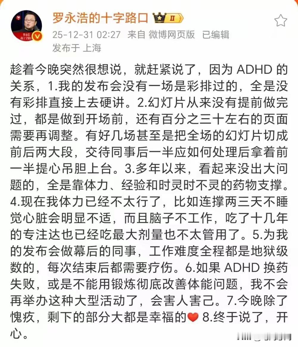 老罗,怪可怜的! 刚才还有大把人在讨伐他,什么不守时,没有拿消费者当回事等等,现在很多人又转头可怜这个中年男人了。 老罗公开说自己有ADHD,就是一着妙棋! 这是企图掩饰能力缺陷?还是另有所图?不得而知,反正很符合老罗的性格。这个ADHD到底是个啥玩意,还真么搞清楚,可能就是拖延症之类的心理问题。 但无论出现多大的错误,老罗一直信奉一句“彪悍的人生不需要解释”,并且这句话可以“横行天下”。如果拿这个事吐槽一下他,我不为过。 毕竟人家靠目前的行业赚了几个小目标了,这能力,这抗压能力无可指摘,得佩服。