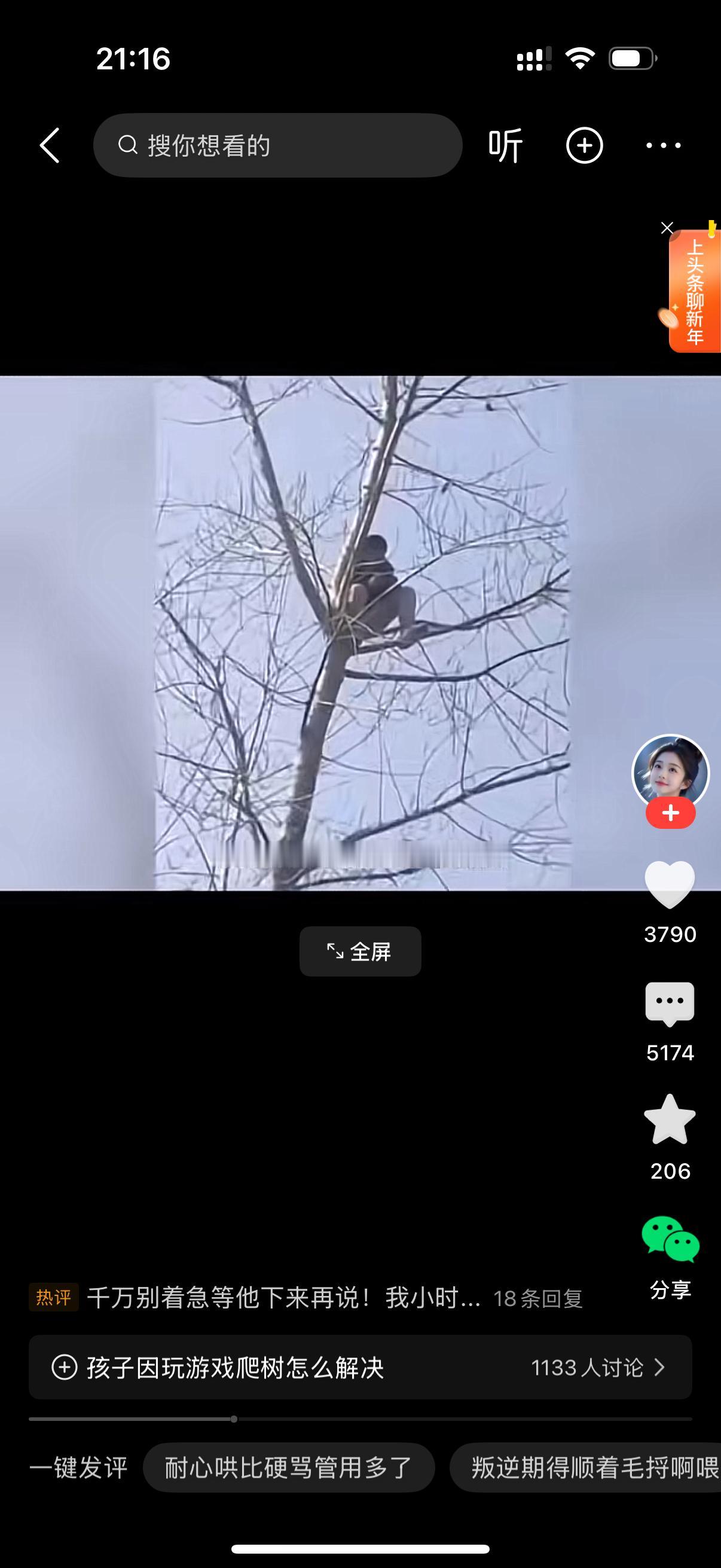 母亲不让孩子玩手机打游戏,孩子不听话就跑到树上玩去了。母亲在树下吓个半死,小孩爬的太高了,一不小心摔下来就是个残废。母亲在下面呼喊孩子下来再玩,再也不管你玩手机打游戏了。孩子却像没听到一样,在上面玩的不亦乐乎。他找到了一个父母不敢管他得位置。这样的熊孩子太不让人省心了。