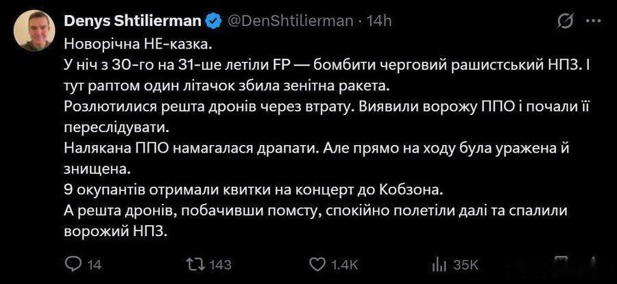 新年惊喜!乌克兰🇺🇦Fire Point 公司的无人机创造奇迹:“12月30日至31日,一群FP无人机奔袭俄境内一家炼油厂。其中一架被击落,其余无人机随即展开反击,发现了防空系统,并将其追击摧毁。九名俄军士兵丧生。剩余的无人机完成了任务,将炼油厂焚毁。” 说明FP无人机通讯系统强大,抗干扰能力强,能够通过“人在回路中”调整作战路线个目标。普京承认自己正在恋爱中俄方公布乌无人机袭击普京官邸细节俄乌冲突