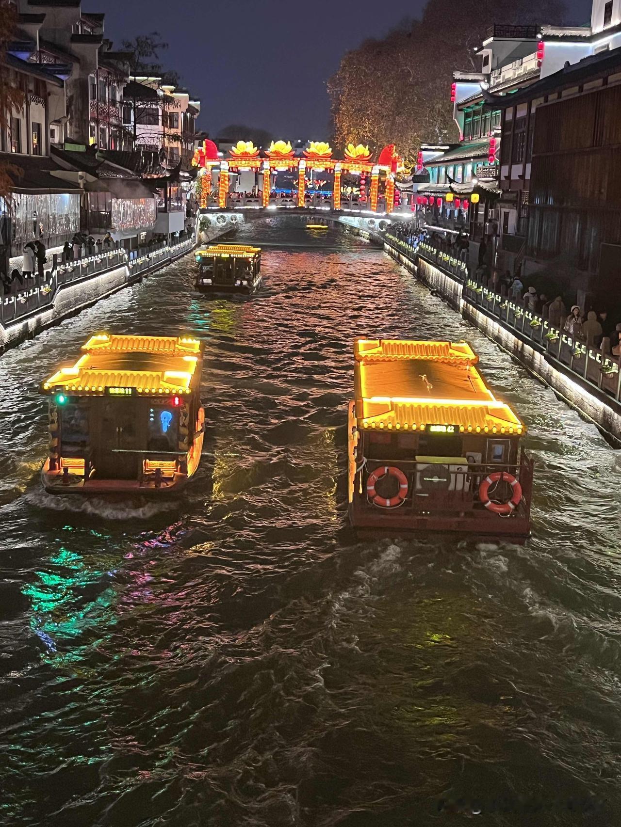 ‼️‼️元旦夜游秦淮河有感 元旦之夜,与先生踱步秦淮河畔,目之所及皆是熙攘人潮,耳畔尽是欢声笑语。流光溢彩的花灯倒映在粼粼水波里,与岸边的朱楼画栋相映成趣,勾勒出一幅活色生香的金陵夜画。 挤在摩肩接踵的人群中,看孩童举着兔子灯雀跃奔跑,听商贩的吆喝声此起彼伏,心底忽然漫上一股暖意。这喧嚣热闹的烟火气,不正是山河无恙、国泰民安的最好注脚吗?泛舟河上时,晚风携着灯影拂过脸颊,先生执起我的手,相视一笑间,尽是岁月静好。 新的一年,不求大富大贵,惟愿家人安康,岁岁无忧。愿我们在烟火寻常里,守得三餐四季,盼得事事顺遂。