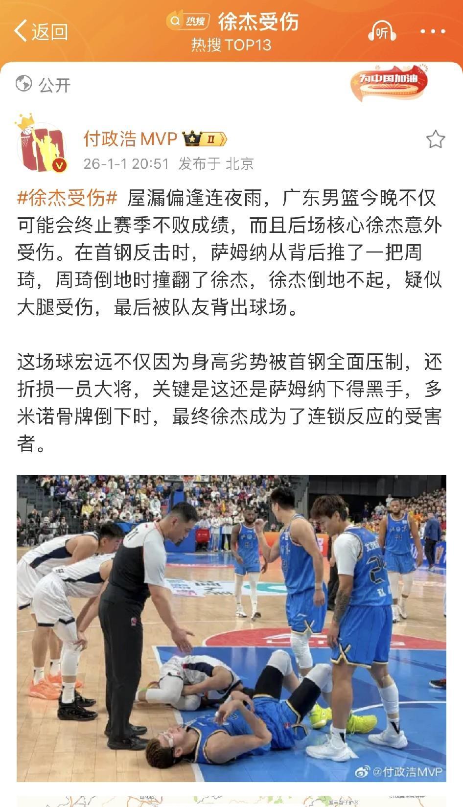 辽宁打北京输13分,广东输31分! 百思不得其解,按理说重建中的辽宁男篮能在客场和北汽僵持36分钟,广东在首节比赛就输两位数,再说前男篮队长胡明轩正负值-36,真担心一个命中率20%的国手,在徐杰伤退后表现差强人意了吧,焦泊乔就出场20秒就不给上,搞不懂杜锋的排兵布阵高明之处,篮球记者付政浩:把徐杰受伤过程描述为萨姆纳背后下黑手,多米诺骨牌倒下时,徐杰成为牺牲者