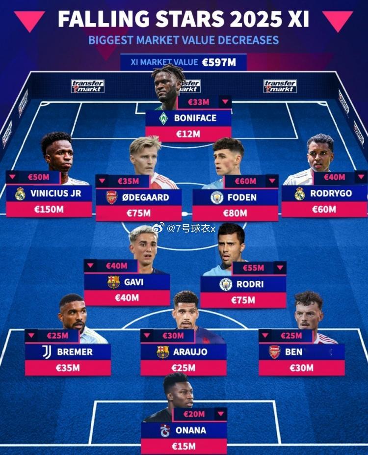 2025年已经过去,《转会市场》也统计了本年度身价下跌最多的一套阵容,巴萨、阿森纳、曼城、皇马各2将。2025身价下跌最多阵:总身价5.97亿欧元中锋:博尼法斯(勒沃库森外租不莱梅,1200万),-3300万前卫:维尼修斯(皇马,1.5亿),-5000万厄德高(阿森纳,7500万),-3500万福登(曼城,8000万),-6000万罗德里戈(皇马,6000万),-4000万后腰:加维(巴萨,4000万),-4000万罗德里(曼城,7500万),-5500万后卫:布雷默(尤文,3500万),-2500万阿劳霍(巴萨,2500万),-3000万本·怀特(阿森纳,3000万),-2500万门将:奥纳纳(曼联外租特拉布宗体育,1500万),-2000万