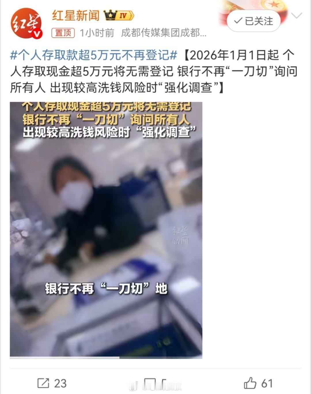 个人存取款超5万元不再登记这个是一个好消息。因为普遍老百姓去存款或者取款,都要被银行职员询问这钱是怎么得来的,要拿去做什么等等。我觉得这种情况只会让过程变得繁琐,防范不了真正有意进行违法犯罪的人,还阻碍了普通百姓的存取款。我觉得只要适度的提醒就好了,如果是被诈骗的中老年人,要进行特别大额的取款,这种行为是很典型和很明显的。不然普通人这点小钱,无非就是两口子工资攒的,用作日常生活花销。现在不用被询问登记太好了,正规合法渠道挣来的一点点辛苦钱,被正儿八经一询问,好像自己做错事了一样。这种感受真的很奇怪 广州
