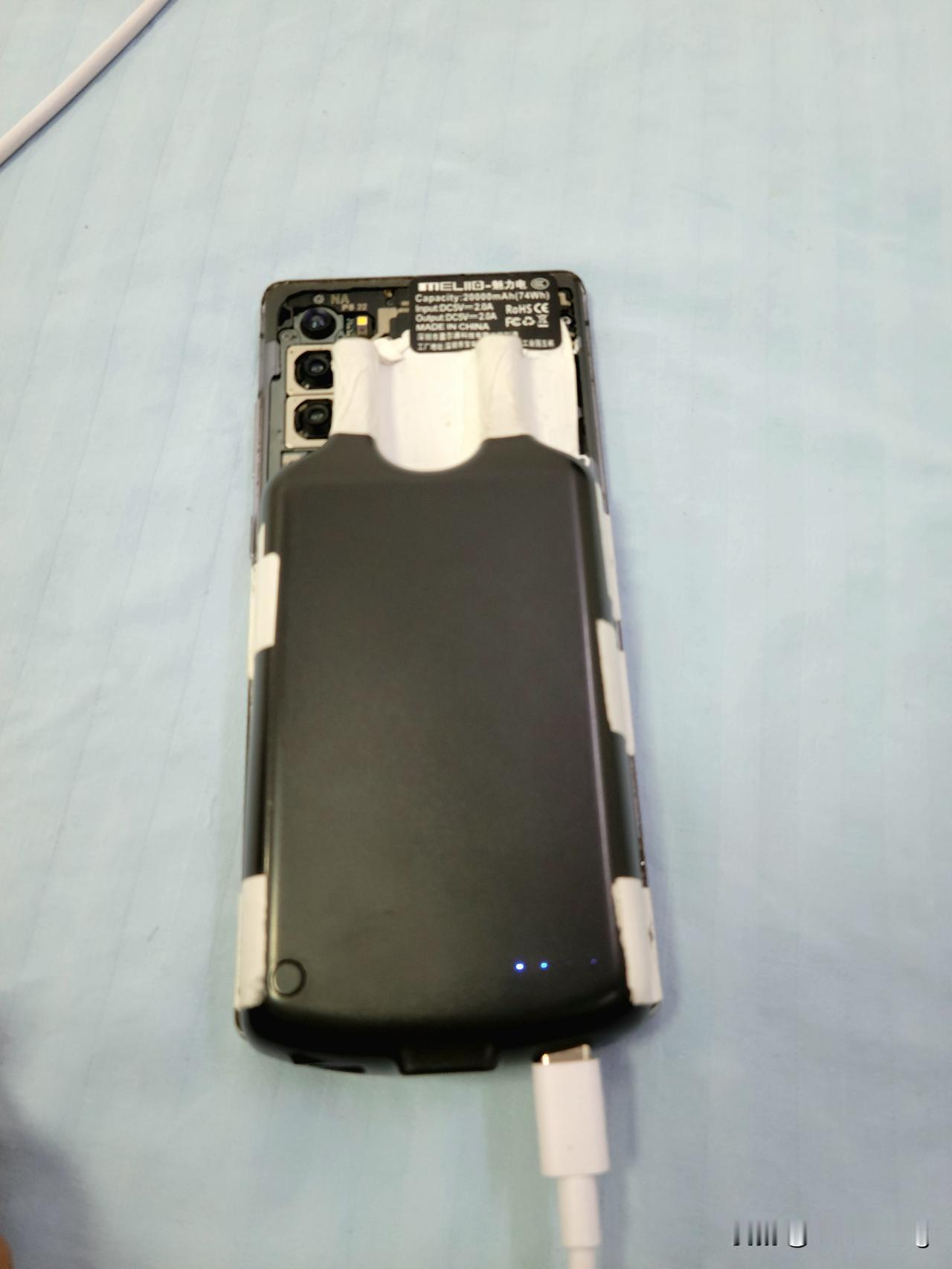 提供一个废旧手机改装超级电霸的改装方案。但是我要把注意事项写在前面。那就是每一项改装,都记得用热熔胶把手机做好防水。包括充电宝本身也必须用热熔胶来处理。因为手机的防水特性已经被破坏! 充电宝如果不能用热熔胶做防水和防御性封闭的处理的话,他可能会因为我们接下来要用焊枪点锡改装的时候。出现一些安全问题! 介绍一下这部手机的基本情况! 这是一部宣布报废的三星note208+256g灰色。手写笔丢失。电池充电小板被烧毁。电池被烧毁。因为在一年多以前,这部手机充电的时候烧了! 所以这部手机就闲置了一年多的时间,由于废物利用的原因,再加上这块屏是可以用的。因此花了50块钱购买了一组排线。同时购买了这么一个相对而言比较奇怪的充电宝,然后把充电宝做了改造。用焊接枪把充电宝和手机包括排线焊接在一起。用绝缘贴纸做了防漏电处理。并将充电宝的原厂标签也贴在了手机的背面,作为一个基础的注解! 这个充电宝的电池是1万毫安。由于手机内部电池被拆除,所以需要短接一个充电小板的附属品。这个有技术含量,建议小白不要轻易模仿。然后把充电排线和手机底部尾插部分焊接在充电宝上。再用绝缘贴纸把充电宝和手机固定在一起,随后在充电宝的顶部,也就是用绝缘贴纸贴出来的这个地方。拉出两个排线,然后把他们和手机主板用焊锡连接在一起。注意需要测试,不要起火! 而且在做这样改造的时候,为了防范起火,还有电池短接烧毁手机主板。尽量把充电宝的电能彻底耗尽。然后再去做改造。另外就是在充电宝的小板上,记得焊接一根接地。尽可能的稳住充电宝的充电涡流。所以充电宝的充电小板和手机的充电排线必须是焊接在一起的。这个改装唯一的问题就是它是一次性改装。这部三星note20的屏幕已经碎了,所以它的内屏没有损坏。因此我给他贴了一张塑料膜,来让它的内外屏保证均匀。就这样这个手机电霸也就改造成功了,它具备1万毫安的电池。可以待机17天,如果用的话可以4天不充。当然因为充电宝是5伏2安的供电 ,所以给它充满需要10个小时。而且因为充电排线的原因,这个手机已经失去了快充的能力。它最大可以承受15瓦的充电。不然就会因为充电排线短接,造成充电宝或者手机烧毁,或者有安全隐患!