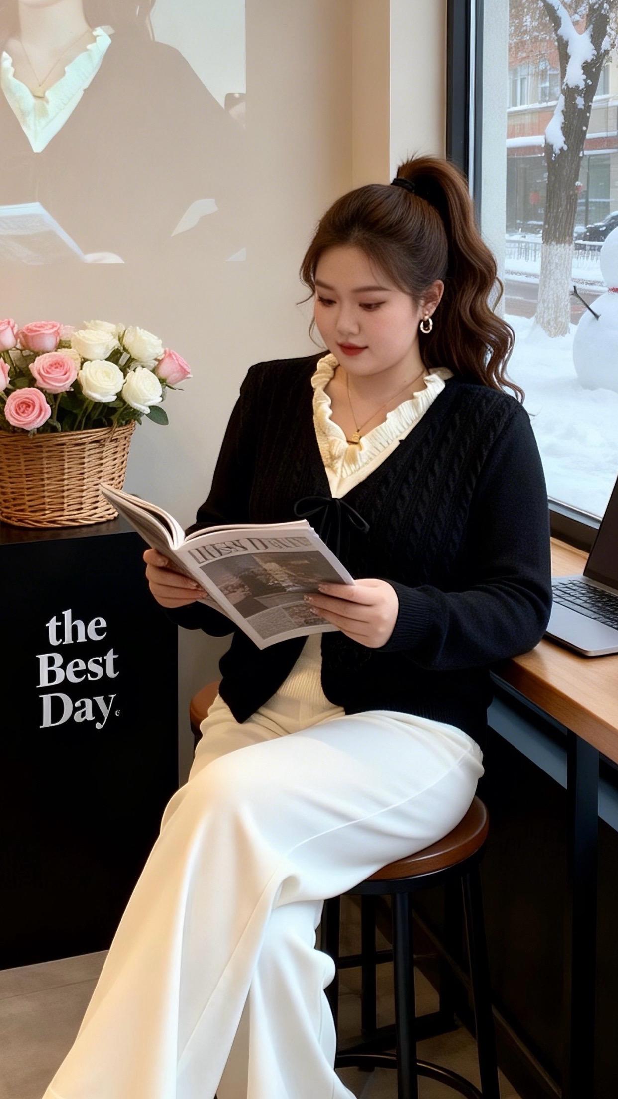 温柔甜美的少女,白色毛衣搭配蝴蝶结发饰,散发着冬日暖阳的气息。🌞💖