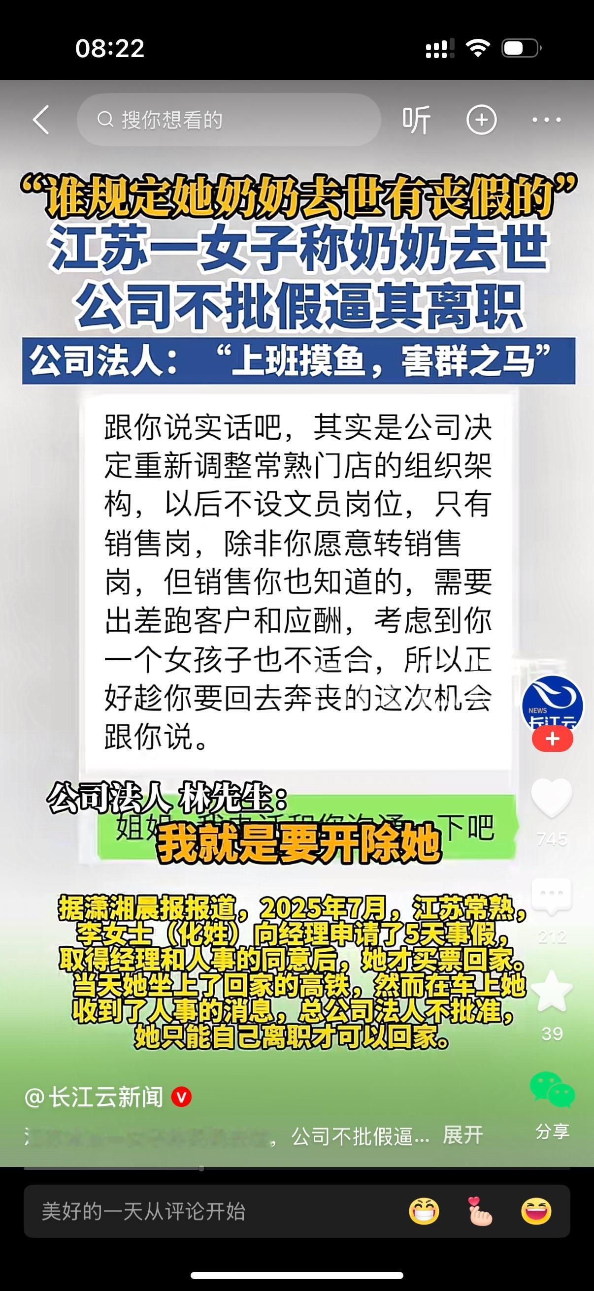 江苏常熟一女员工的奶奶过世。女子请丧假,公司老板不批,倒逼其离职。女子不解为什么奶奶过世没有丧假?老板说,谁规定她奶奶过世有丧假的?我就是要开除她。平时上班摸鱼,害群之马。原来老板看女员工早就不顺眼了,利用这次机会让人家离职而已。