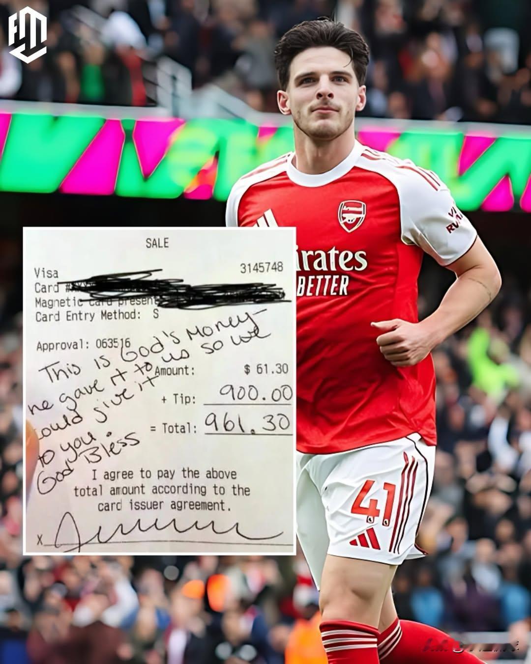 德克兰·赖斯的人品在球场内外都属实难得,最近他在一位名叫莉莉的服务员提供优质服务后,在收据上给她留下了手写纸条。赖斯在仅有61美元消费后给出了900美元的小费, 最打动人的是什么?莉莉完全没有认出他来。没有特殊待遇,不刻意吸引注意,只是纯粹的善意。