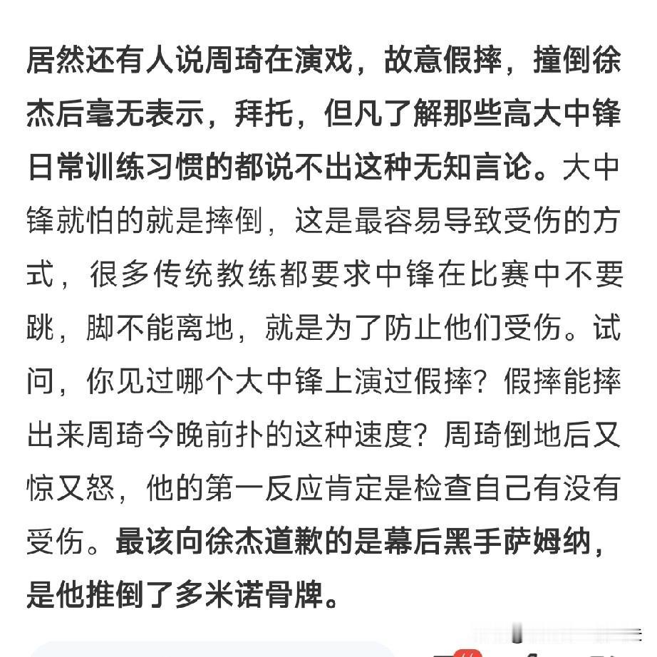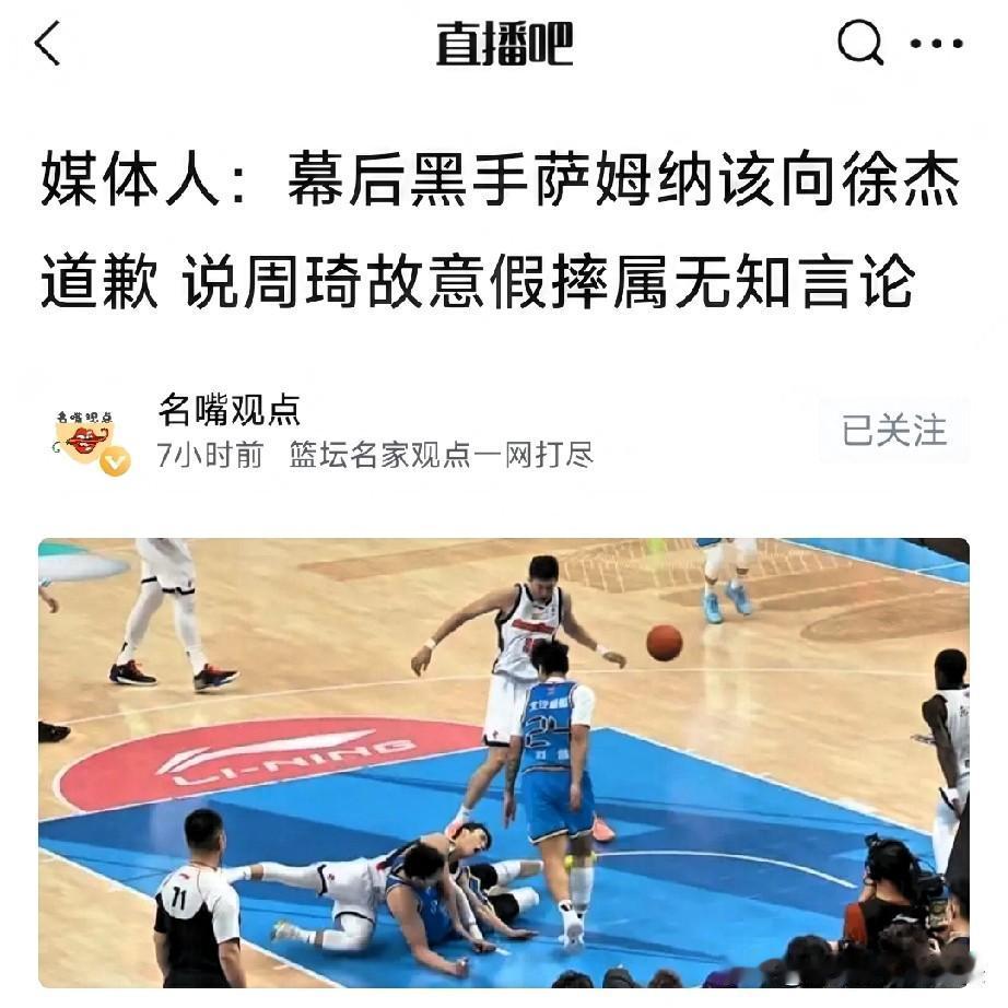 广东惨败夜,媒体人敦促萨姆纳向周琦和徐杰道歉!称“幕后黑手”。恕我眼拙,萨姆纳的确在阻止周琦下快攻时做出非职业球员防守动作,上面用手推周琦的腰,下面用脚勾拌周琦的脚,得亏是徐杰充当缓冲垫的角色,否则后果不堪设想,借此媒体人付政浩赛后发文称没悬念的比赛,萨姆纳把徐杰搞伤百死莫赎,想想不无道理,国家队比赛临近,徐杰的受伤关系很大。谢教父也同样要求萨姆娜立刻道歉
