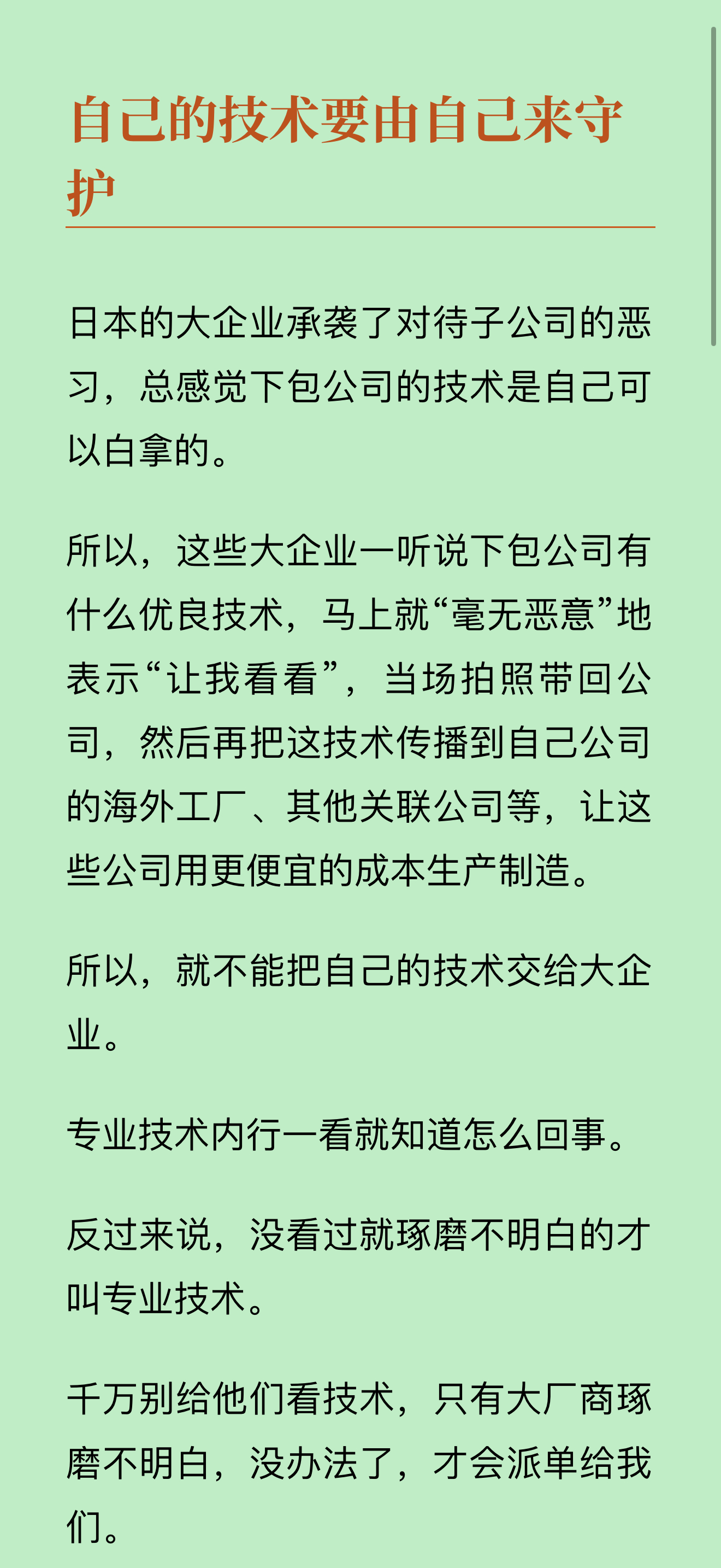 作者是日本一家专精特新企业主,读开头觉得有点虚,读到后面则越来越实,其实企业的运营就是企业家的观察、认知和行动,实战过得人写的书还是比较深刻。 这本书其实就是一本作者的吐槽书,从作者的吐槽中,撕开了日本真正的遮羞布,什么大企业对供应链友好、工匠精神,什么重视知识产权,重视工匠精神,作者都有自己的视角。