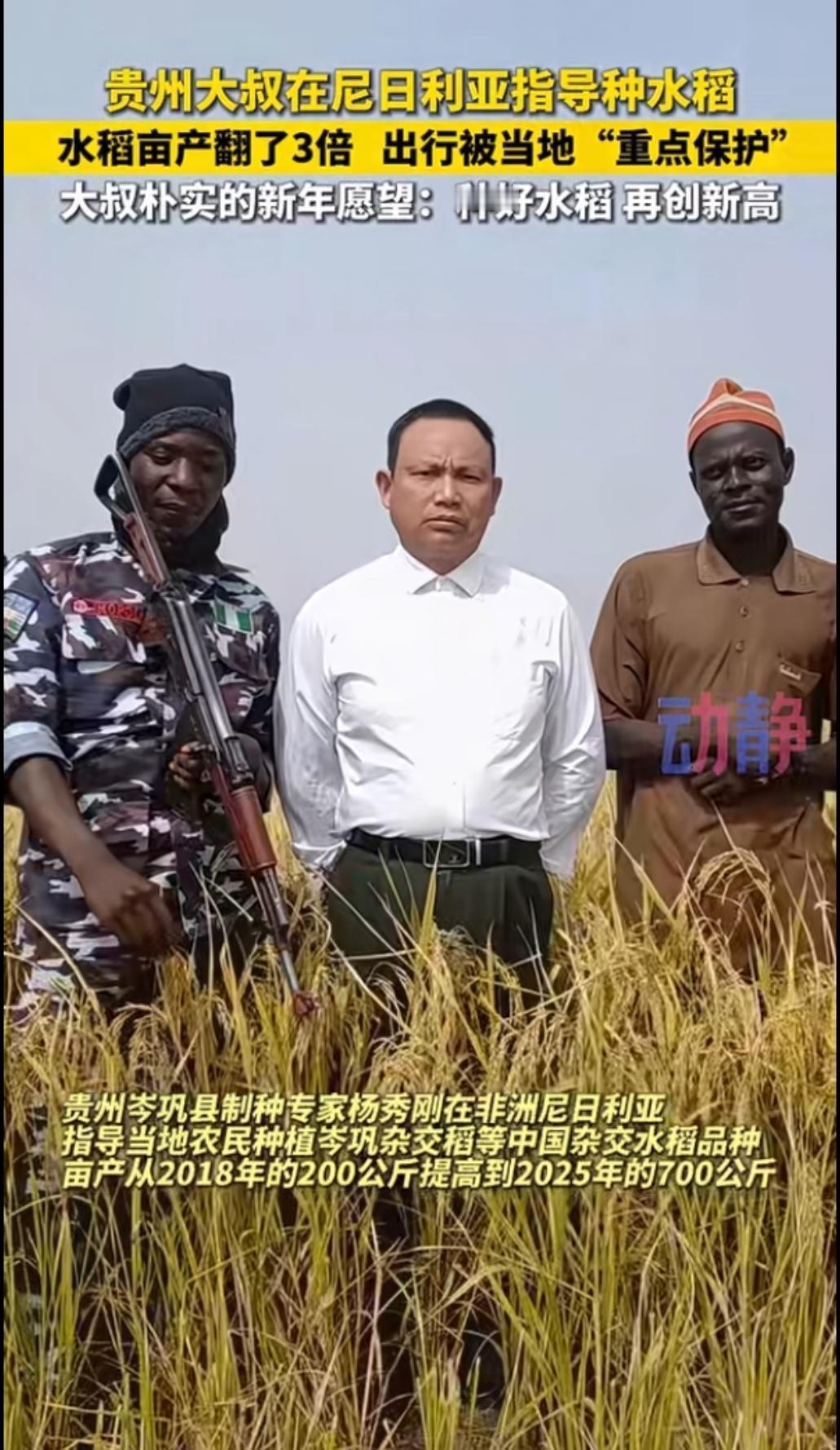 贵州大叔在尼日利亚种水稻 ,出行“派人持枪重点保护”!领不丁看见这张图片以为被绑架了呢?贵州大叔带他们种出的水稻是他们的三倍!大叔了不起,用恩泽四海这句词形容一点不为过,非洲国家大家都了解,落后的很,咱们把这么先进的技术交给他们,这是在拯救他们国家,有点智商的非洲领导都懂得怎么做,所以拿枪保护也不足为奇!将来贵州大叔要被他们载入历史的,非洲袁隆平。为大叔点赞!👍
