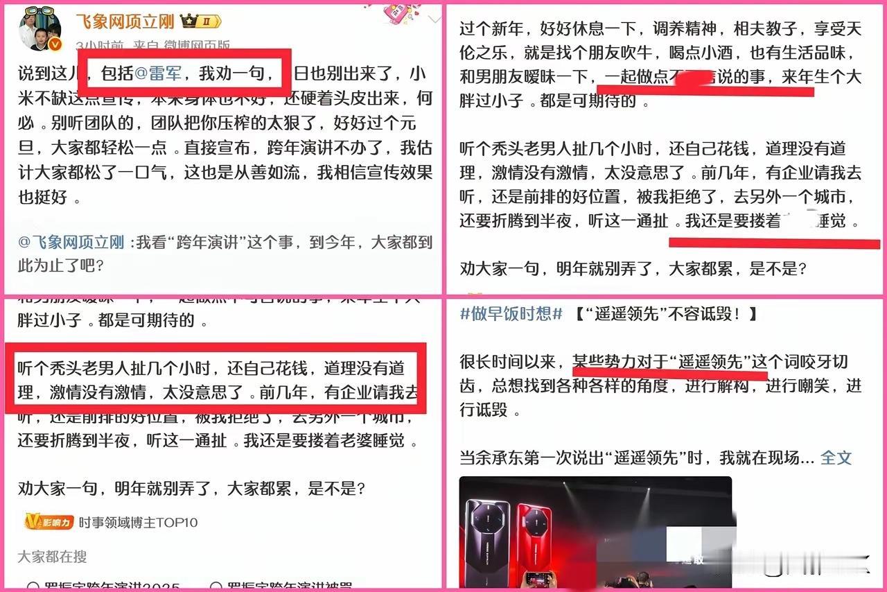 雷军原计划于2025年12月31日晚8点进行跨年直播,但因感冒症状严重,于12月31日通过微博宣布活动延期至2026年1月3日晚7点。 直播中将由工程师现场拆解小米首款SUV车型YU7,并讨论2025年行业回顾与2026年展望。 雷军的湖北老乡项立刚劝雷军别出来了,小米也不缺这点宣传流量,估计雷军也不会理他,感觉项立刚最近到处碰瓷蹭流量啊![笑哭]