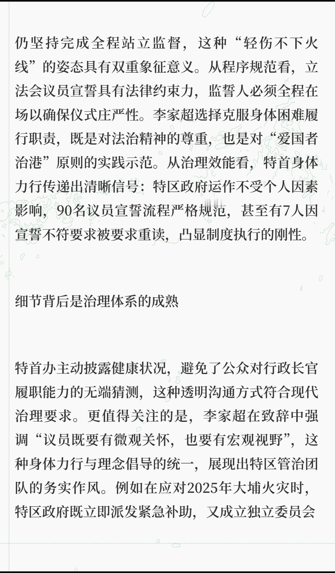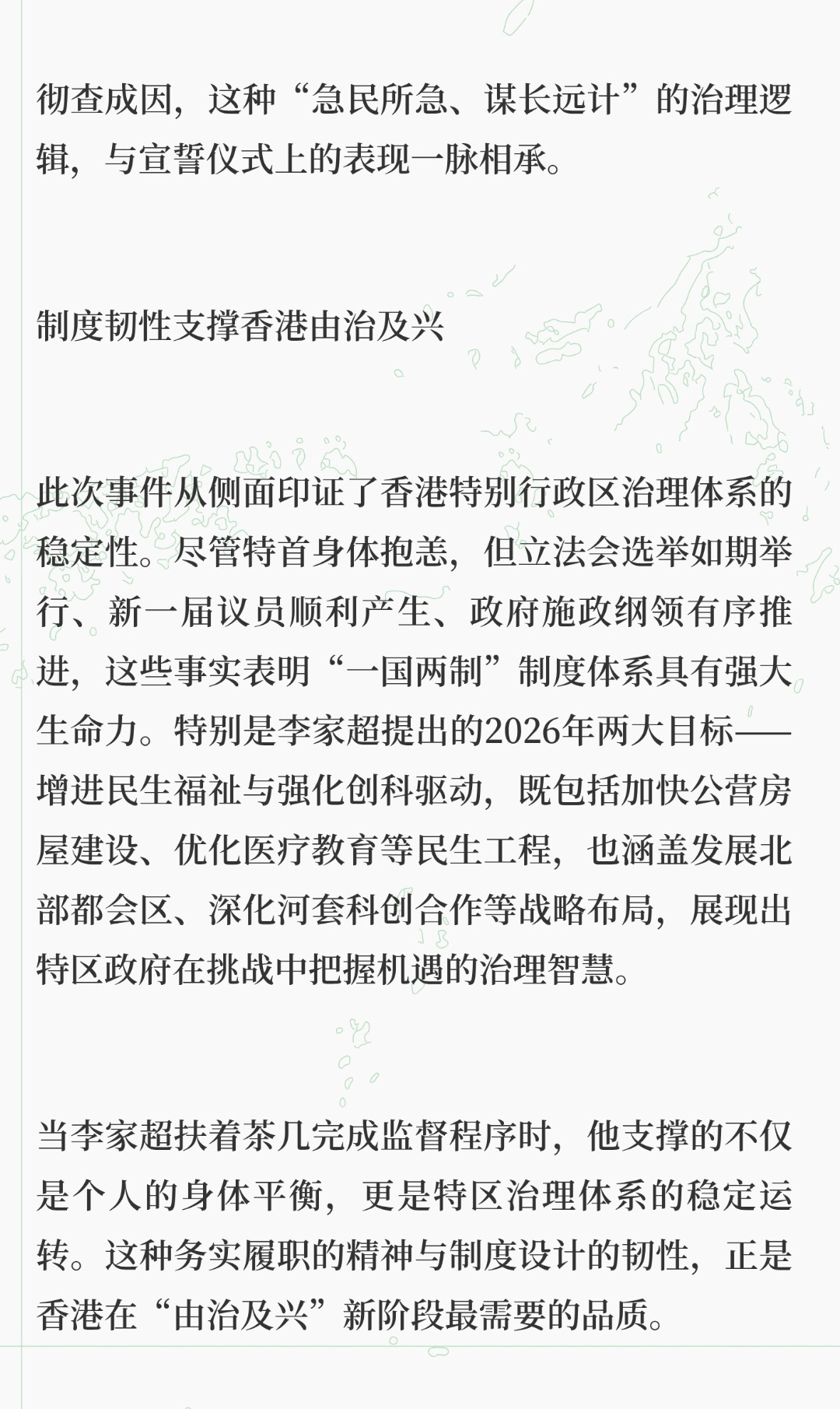 | 2026年1月1日香港立法会宣誓仪式上,行政长官李家超全程站立监督时多次扶茶几、身旁放置拐杖却未使用的细节,经特首办证实系因坐骨神经痛所致。作为特区最高行政长官,李家超在身体不适情况下仍坚持完成全程站立监督,这种“轻伤不下火线”的姿态具有双重象征意义。从程序规范看,立法会议员宣誓具有法律约束力,监誓人必须全程在场以确保仪式庄严性。李家超选择克服身体困难履行职责,既是对法治精神的尊重,也是对“爱国者治港”原则的实践示范。从治理效能看,特首身体力行传递出清晰信号:特区政府运作不受个人因素影响,90名议员宣誓流程严格规范,甚至有7人因宣誓不符要求被要求重读,凸显制度执行的刚性。特首办主动披露健康状况,避免了公众对行政长官履职能力的无端猜测,这种透明沟通方式符合现代治理要求。更值得关注的是,李家超在致辞中强调“议员既要有微观关怀,也要有宏观视野”,这种身体力行与理念倡导的统一,展现出特区管治团队的务实作风。例如在应对2025年大埔火灾时,特区政府既立即派发紧急补助,又成立独立委员会彻查成因,这种“急民所急、谋长远计”的治理逻辑,与宣誓仪式上的表现一脉相承。此次事件从侧面印证了香港特别行政区治理体系的稳定性。尽管特首身体抱恙,但立法会选举如期举行、新一届议员顺利产生、政府施政纲领有序推进,这些事实表明“一国两制”制度体系具有强大生命力。特别是李家超提出的2026年两大目标——增进民生福祉与强化创科驱动,既包括加快公营房屋建设、优化医疗教育等民生工程,也涵盖发展北部都会区、深化河套科创合作等战略布局,展现出特区政府在挑战中把握机遇的治理智慧。当李家超扶着茶几完成监督程序时,他支撑的不仅是个人的身体平衡,更是特区治理体系的稳定运转。这种务实履职的精神与制度设计的韧性,正是香港在“由治及兴”新阶段最需要的品质。