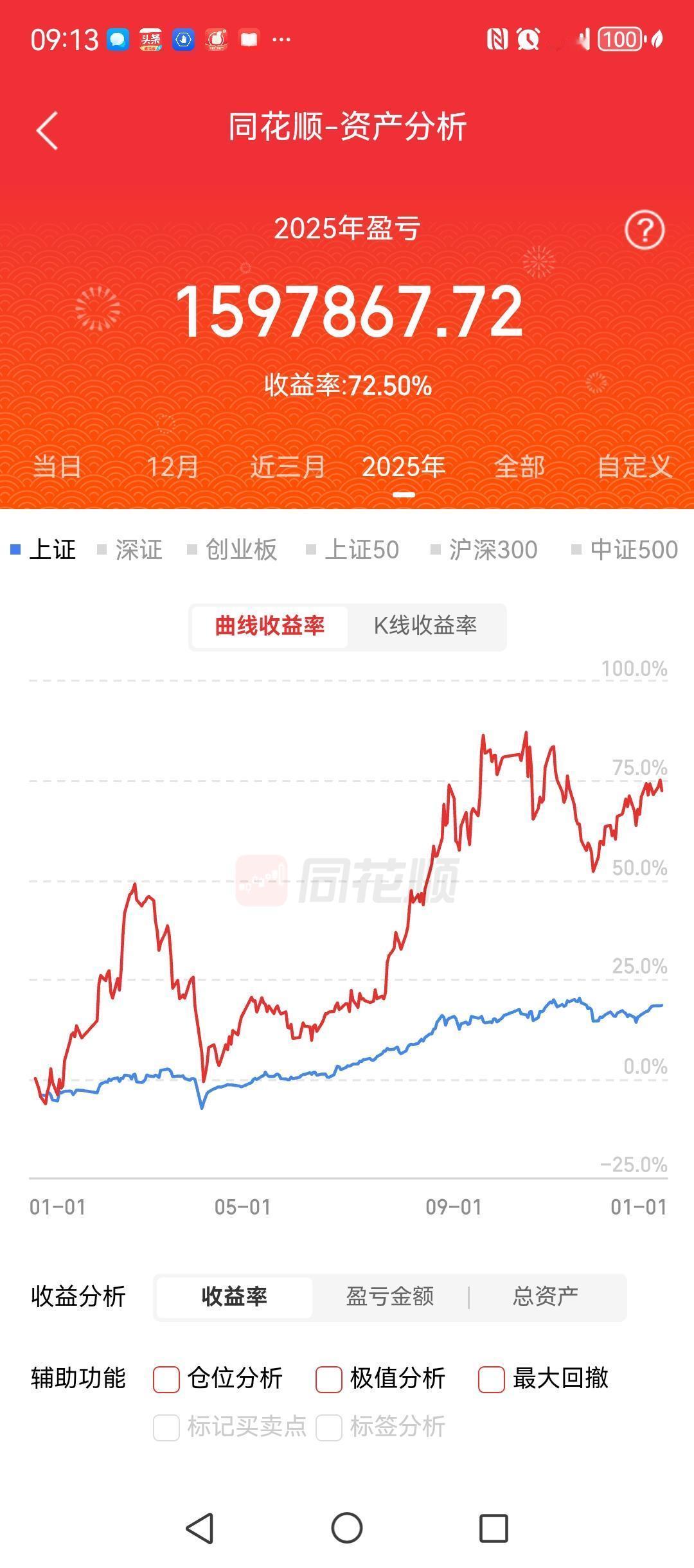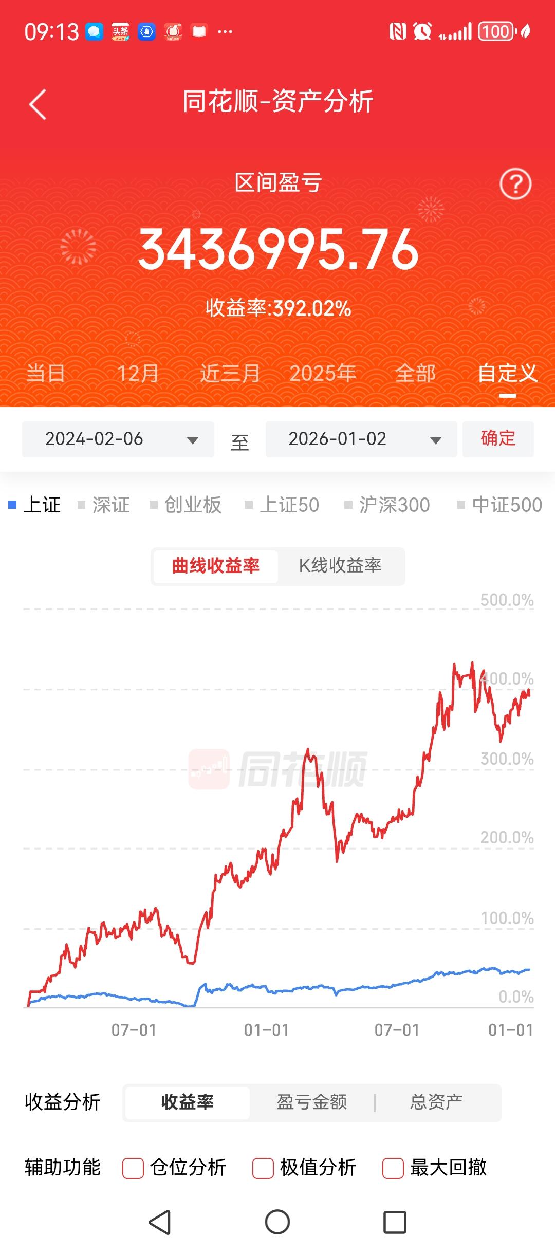 2019年到2025年,6年1100%,最高时突破1200%。 2024年2月6号至今,不到两年,收益接近400%。 2025年,收益73%。 盈利实现的过程是这样的: 2019年二月二十一号买入生益科技,8月27号卖掉。2019年9月5号买入603118共进股份,2020年3月16号卖掉。2020年5月19号买入东方电缆, 2020年8月11号卖掉。2021年3月12号买入沃尔核材,2024年10月23号卖掉。2021年6月25号买入通富微电,2024年11月7号卖掉。2024年10月30号买入水晶光电,2025年9月15号卖掉。2024年12月6号再次买入生益科技,2025年1月21号卖掉。 2025年,除了上述的两次卖出之后,重新买入股票后仓位一直保持满仓,持有至今。他们都是科技股,一只属于人形机器人板块,另外一只是电子元器件板块。其中的机器人个股持有时间已经一年有余,目前收益在80%左右。 2020年8月11号卖出东方电缆之后,有一段时间是不赚钱的,出现了将近35%左右的回撤。 2021年3月12号之前,对共进股份,建投能源,银信科技和格林美的操作都是很不成功的,买卖不当,出现了较大亏损。 否则,这6年的收益可能就不是1200%,而是2200%了。 痛定思痛,吃一堑长一智。2021年9月份之后,我的操作就更加稳健了,再也没有出现过亏损。 千淘万漉虽辛苦,吹尽狂沙始见金。 2025,乘风破浪,收获满满! 2026,百尺竿头,更进一步!