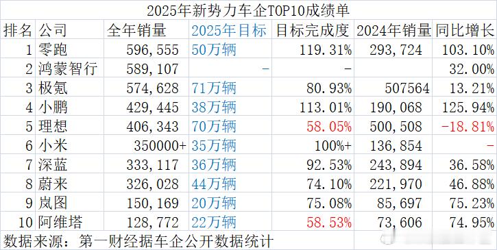 造车新势力,2025全年汽车销量数据公布!仅3家完成年度目标:零跑、小鹏、小米