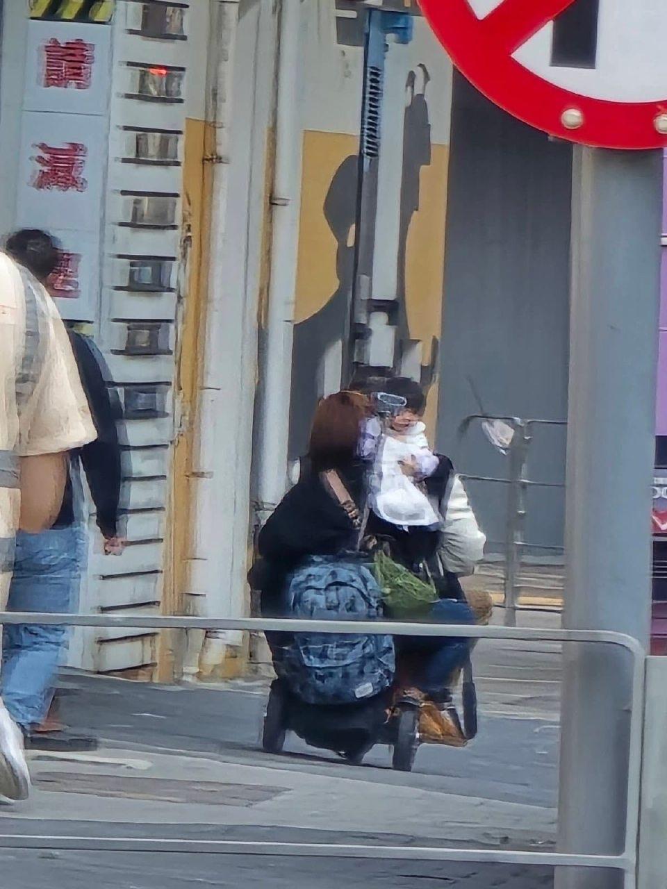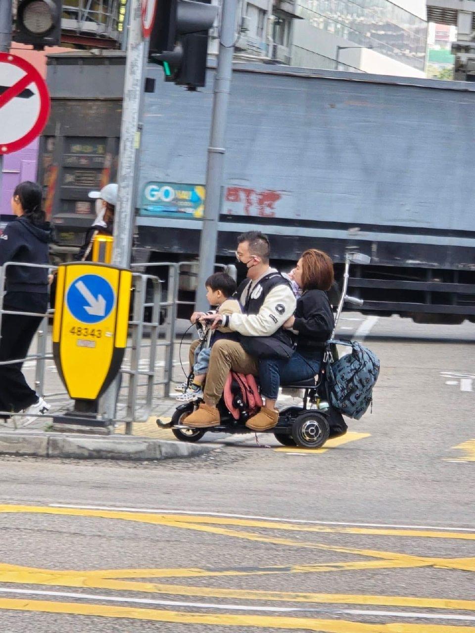 一家人齐齐整整过马路。 細路坐車頭,$2000 三個冇安全带,$15000 冇牌电动移动工具,$5000 冇三保,$10000 如果冇驾驶执照,$5000