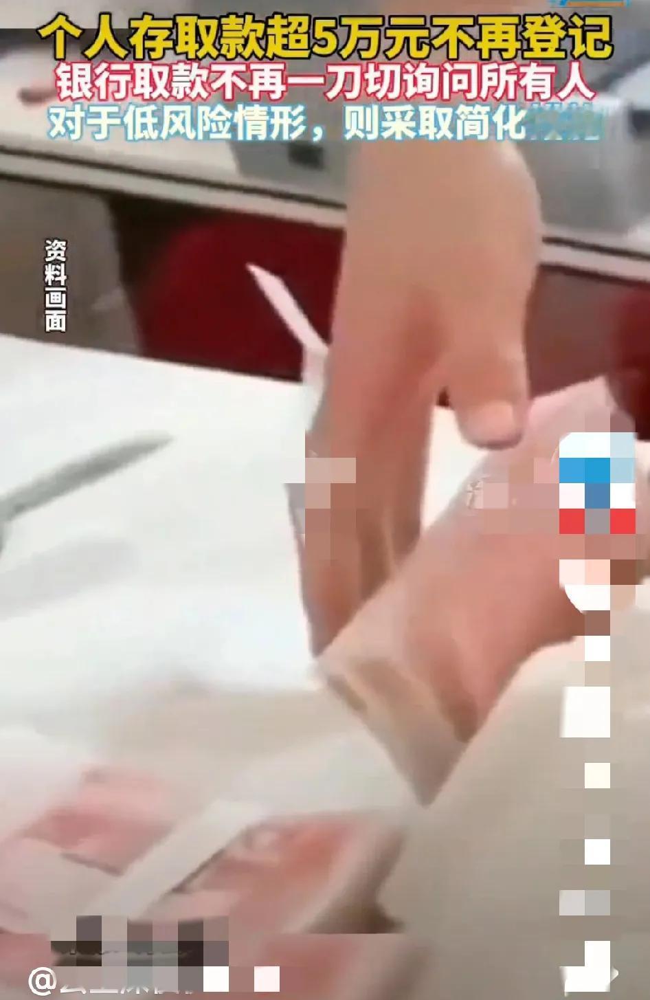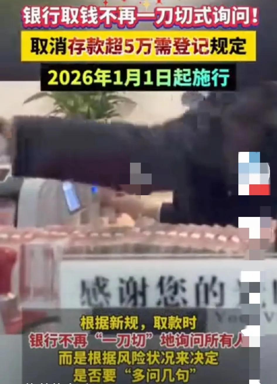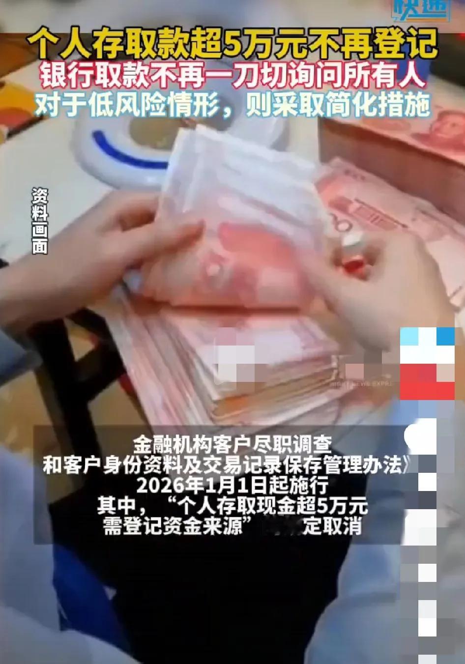 好消息!取钱终于不用求爷爷告奶奶了,也不用和做贼一样被审来审去的了!2026年1月1日起,中国实施了新的金融监管规则,核心变化是取消了个人存取现金单笔超过5万元必须登记资金来源的规定。 首先,这项调整基于风险为本原则, 银行不再对所有大额取款进行“一刀切”询问,而是根据客户风险状况灵活处理:对于低风险情况采取简化措施,高风险时则强化调查了解资金来源和用途,旨在平衡反洗钱要求与金融服务便利性。 另外,新规体现了监管精细化转型, 从过去普遍登记转向精准施策,既降低合规成本又提升效率,同时强调个人信息保护,要求金融机构严格保密用户信息。