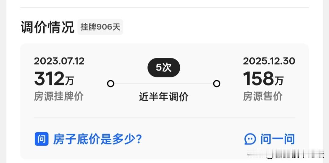 从三百一十多万,到一百五十多万,三年也没卖掉。现在很明显,有这150万预算的到了2026年又看不上这个房子了。 其实准备要卖的房子,不能一点点的降。要么就不卖,自己住或者出租。看看后面到底是拆迁还是旧城改造。不过就怕贷款太多扛不住的。