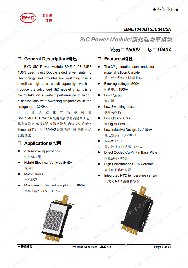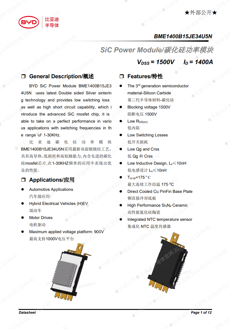 比亚迪半导体公开了1500V碳化硅模块规格书,意味着其1500V耐压碳化硅已经能够批量外供出货,也就是1700V碳化硅也量产自用了。猜一下谁会第一个上1500V?厂长说电池大v聊车比亚迪