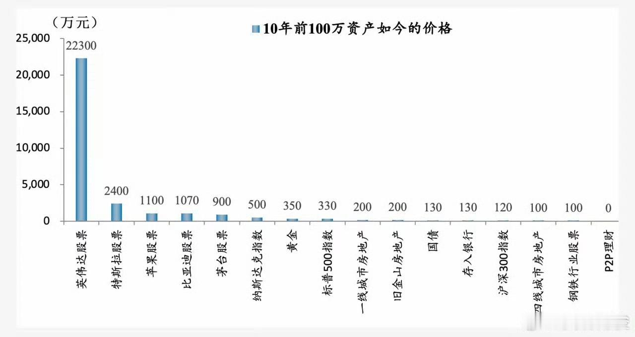 如果10年前你有100万,买不同资产,你知道现在值多少吗? 如果买英伟达股票,拿到现在,2.2亿元。 特斯拉:2400万元 苹果:1100万元 茅台股票:900万元 纳斯达克指数:500万元 比特币:2.3亿元 黄金:350万元 国内一线城市房地产:200万 国债:130万 存银行:130万 沪深300指数:120万 三四线城市房地产:100万 钢铁股票:80至100万 如果你在10年前买P2P,财富归0。