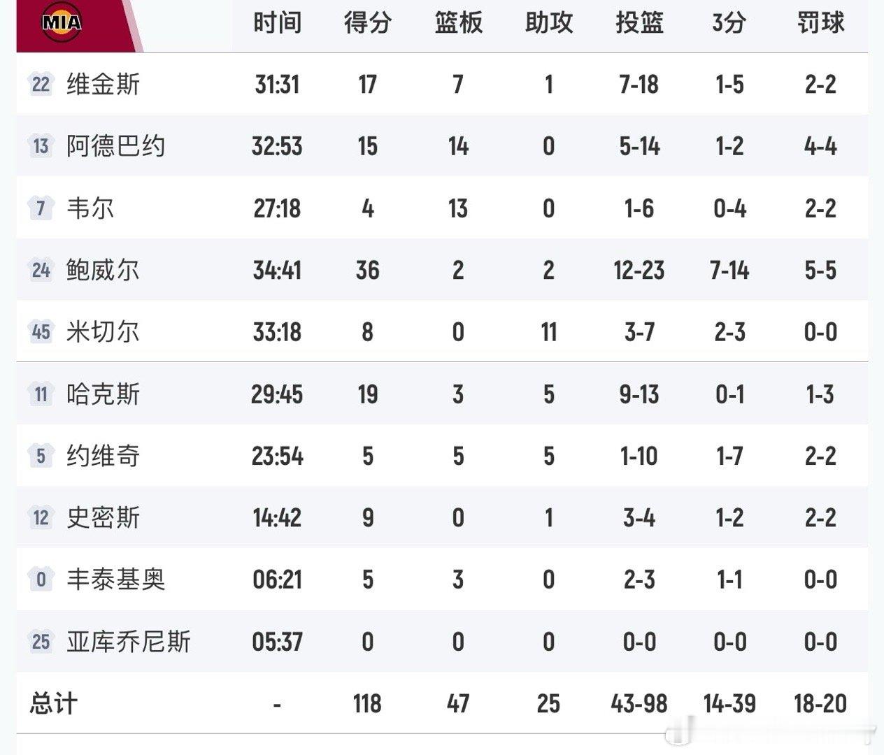 热火118-112险胜活塞,取4连胜鲍威尔36分,哈克斯19分5助攻,维金斯17分7篮板CC 31分8篮板11助攻,萨瑟18分