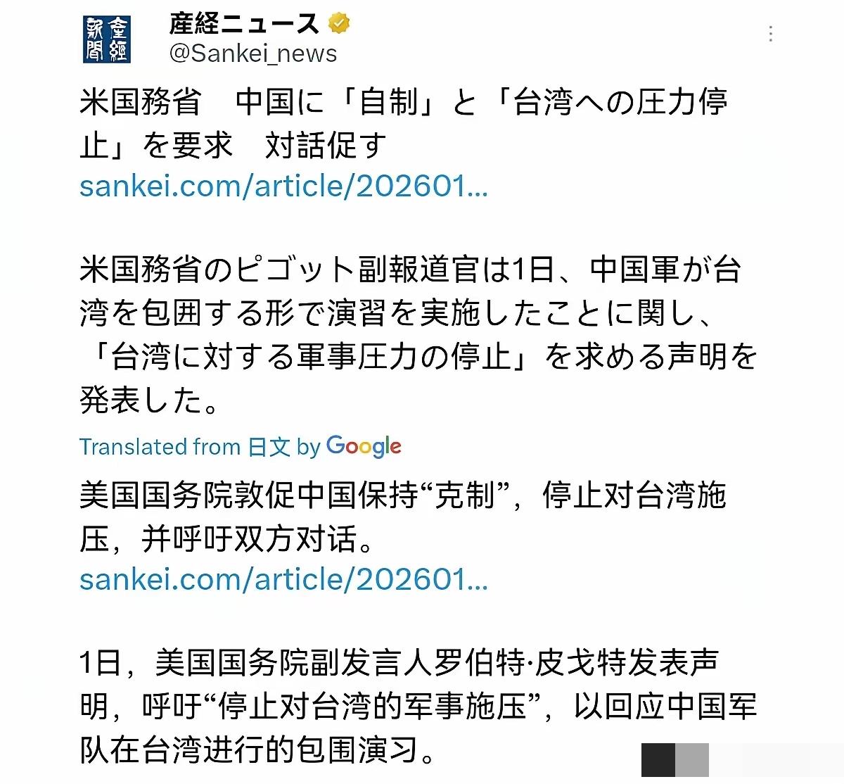1月2日,根据日媒报道,对于我们举行的军演,美国作出正式表态。 美国国务院副发言人罗伯特·皮戈特表示,我们支持台海和平稳定,我们反对任何单方面改变现状的行为,包括使用武力或胁迫手段。针对台湾或该地区其他国家的军事活动是不必要地加剧紧张局势。 这番表态听着冠冕堂皇,实则满是虚伪与双标。 谁是台海局势的真正搅局者,国际社会看得一清二楚。 台湾自古就是中国领土,《开罗宣言》《波茨坦公告》等一系列国际文件早已明确这一法理事实,一个中国原则更是183个建交国的普遍共识,这才是台海真正的“现状”。 美国嘴上喊着反对“单方面改变现状”,手上却在不断突破红线。 就在不久前,美方批准了高达111亿美元的对台军售,创下历史新高,这哪里是维护和平,分明是在给“台独”分裂势力递刀。 从向台湾出售F-16零部件到先进地对空导弹系统,再到在日本部署B-1B轰炸机、在菲律宾部署陆基反舰导弹,美方一步步在台海周边织起军事包围圈,这种实质性改变现状的行径,才是加剧紧张局势的根源。 我们的“正义使命-2025”军演,完全是维护国家主权的正当合法行动。 演习针对的是“台独”分裂势力和外部干涉,重点演练海空战备警巡、要港要域封控等科目,舰机多向抵近台岛,这是对分裂分子的严正警告,更是捍卫国家核心利益的必然选择。 正如国防部所言,这些演习符合国际法和我国法律,具有完全的正当性,无可非议。 美国一边在中美三个联合公报中承诺不支持“台独”,一边不断纵容分裂势力,这种说一套做一套的操作,早已失去国际社会的信任。 岛内超过800万人联署弹劾顽固谋“独”的赖清德,就足以说明“台独”行径不得人心。 中国早已不是70多年前的中国,无论美方如何给台湾“武装加码”,都挡不住祖国统一的历史大势。 所谓“加剧紧张局势”的指责,不过是美方干涉中国内政的借口。 真正的和平,不是纵容分裂的虚假平衡,而是基于一个中国原则的稳定与安宁。 任何企图分裂自己国家的势力,任何妄想干涉他国内政的外部力量,终将被历史洪流所吞没。 各位读者你们怎么看?欢迎在评论区讨论。