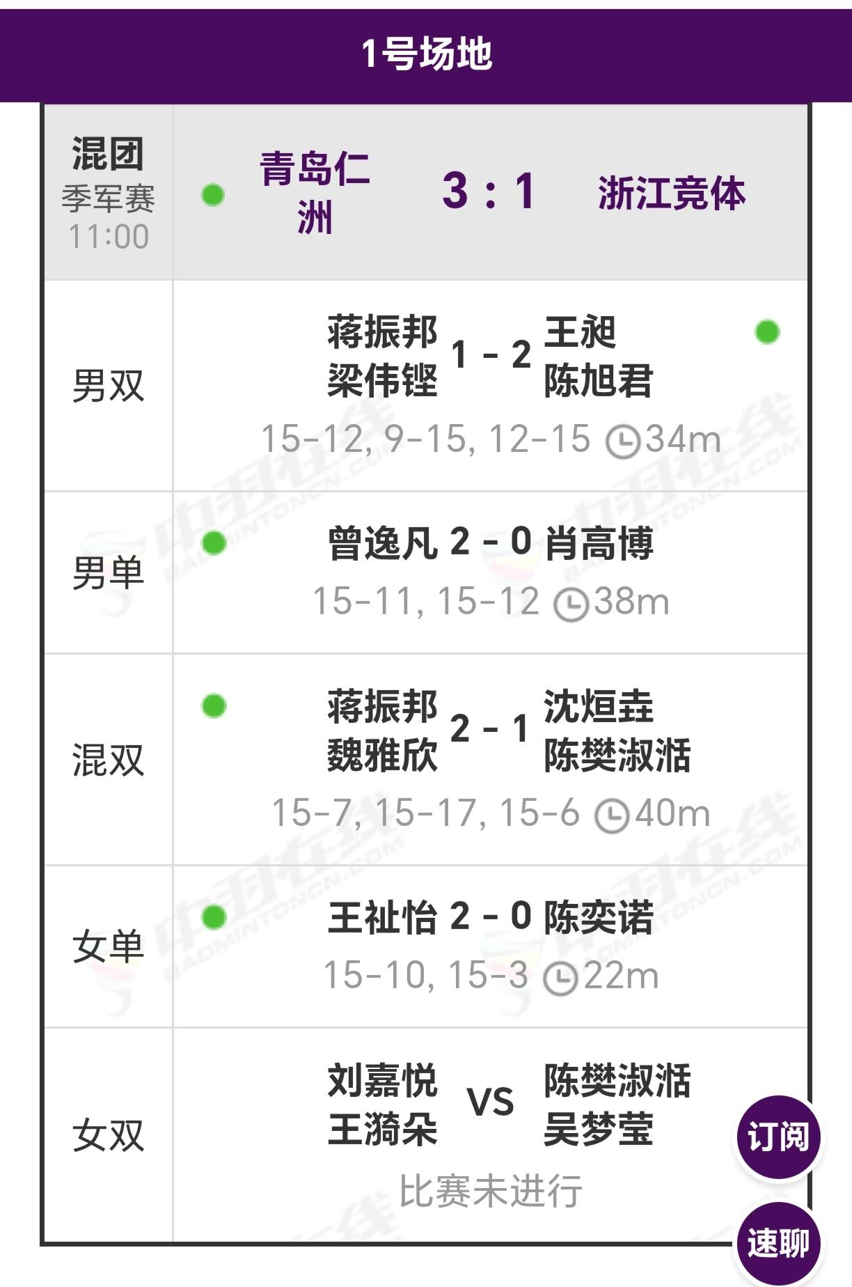 没有大咖(徐、黄)参赛的浙江竞体真是不堪一击,继昨天半决赛0-3输给厦门银行后,今天三四名赛又是1-3不敌青岛仁洲 2025至2026年羽超联赛总决赛 首先进行的是三、四名争夺战,青岛仁洲队对阵浙江竞体队,继昨天半决赛一样,浙江竞体队外援徐承宰和混双名将黄雅琼缺席,半决赛被厦门银行3-0零封,输得干净利落,今天三四名争夺战,大咖徐承宰和黄雅琼依然缺阵,靠一个王昶难以救活球队,首场王昶/陈旭君以2-1(12-15、15-9、15-12)逆转战胜国家队队友梁伟铿搭档蒋振邦组合,取得开门红,可惜队友不给力,随着女单王祉怡2 - 0(15-10, 15-3)轻取陈奕诺,青岛仁洲队以3-1战胜浙江竞体队,获得羽超联赛第三名。缺了大咖徐承宰和黄雅琼的浙江竞体队实力大打折扣,输球也在情理之中!恭喜青岛仁洲队![烟花][烟花]