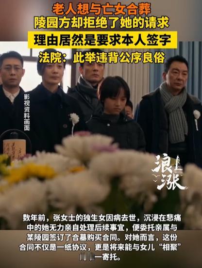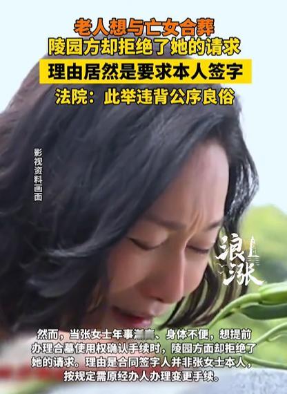 老人自知时日无多,提前筹备后事,想和亡女合葬在一起,本以为会很顺利,结果却遭到陵园方拒绝,理由居然是要求本人签字,老人觉得受到了侮辱,坦言:“我就想将来和女儿葬在一起,这有什么错?”一气之下将陵园方告上法院,法院判了! 好些年前,张婆婆的独生女得重病走了,这打击对她来说太大了,整个人都泡在悲痛里,更没力气去处理女儿的身后事。没办法,她只能托家里的亲属,帮自己去当地一家陵园签了合墓的购买合同。 在张婆婆心里,这合同可不只是一张纸,是将来能跟女儿“再见面”的唯一指望,是她晚年最大的精神依靠。亲属也懂她的心情,很快就把所有手续都办好了,张婆婆这才稍微放下心来。 日子一天天过,张婆婆身体也越来越差,偏瘫之后出门办事更是难上加难。她想着趁自己还清醒,提前把合墓的使用权确认手续办了,省得以后给家里人添累赘。于是就让亲属陪着,找到当年签合同的陵园说明情况,可得到的答复却是不行。 陵园的人说,他们内部有明确规定,合同上签字的不是张婆婆本人,现在要确认使用权,必须找当初的经办人来办变更,不然这事就办不了。 张婆婆和亲属赶紧跟陵园解释,把当年的情况说透了——不是不想自己签,是当时痛失女儿太难受,身体也扛不住,才托亲属代签的,这些年合墓的所有费用也都是她自己出的。 可不管怎么说,陵园就是不松口,一口咬定要按内部规定来。来回沟通了好几次都没结果,张婆婆心里又急又凉,她实在想不通,自己就想跟女儿葬在一起,这么朴素的心愿,怎么就这么难。 没办法,张婆婆只能拖着病体去法院起诉,希望法律能帮她了了这个心愿。 法院判了,说张婆婆想跟亡女合葬是人之常情,符合公序良俗,陵园拿“非本人签字”当理由拒绝,既违背公序良俗,也不公平,确认张婆婆享有这个合墓的使用权。 判决下来后,陵园也服了软,说会主动上门帮张婆婆办变更手续。 《民法典》,民事主体可以委托他人代为实施民事法律行为,张婆婆当年委托亲属签合墓合同,只要是真实意愿,这委托就有效,合同权利也该归张婆婆。 违背公序良俗的民事法律行为是无效的,陵园的内部规定再严,也不能凌驾于公序良俗之上。另外,殡葬服务本身就带着人文关怀的属性,不能只讲冷冰冰的规定,忽略了家属的情感需求。 对于服务行业来说,尤其是殡葬、养老这种和群众情感、特殊群体紧密相关的行业,制定规定时不能只算“管理账”,更要算“人情账”,多考虑老年人、重病患者这些特殊群体的实际困难,预留灵活变通的空间。 你们对此事怎么看?