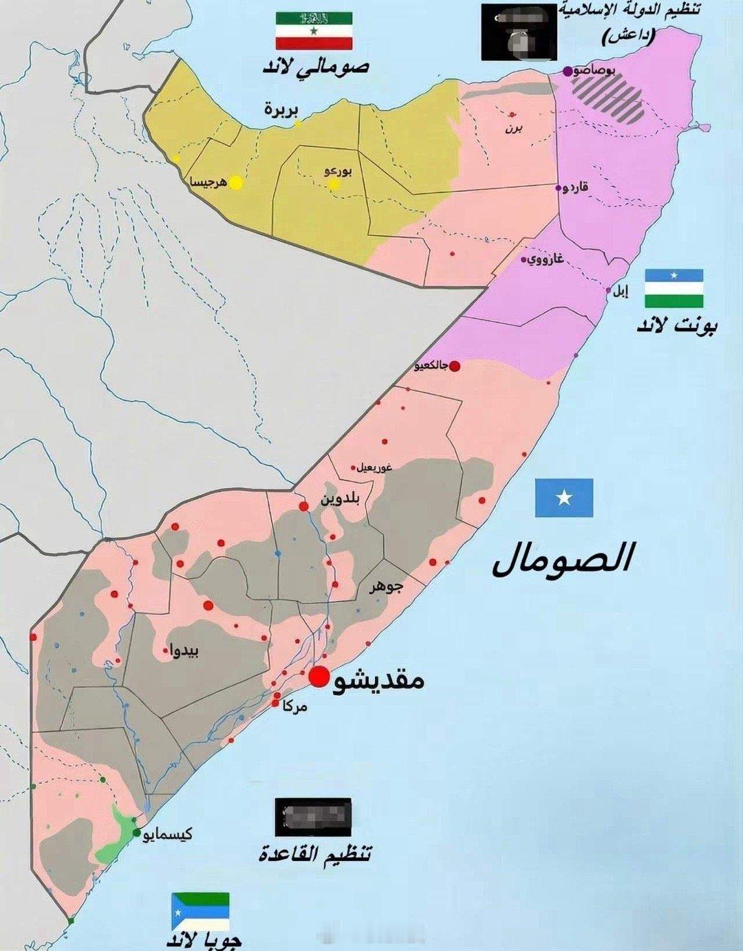 索马里经过30年内战,早就已经四分五裂,除了以色列支持的索马里兰,还有多个分裂势力。在地图上,粉色部分,为索马里政府控制地区。在紫色地区,是邦特兰地区政府在控制。在地图的绿色部分是,朱巴兰地区,在这里也有一支武装力量在控制。黄色部分是索马里兰控制区域。在索马里的灰色区域,这里是恐怖武装青年党力量控制的区域。在地图的黑色部分,这里是IS非洲分支控制区域。索马里的问题几乎就是无解的!因为,索马里这个国家,就是1960年,英国殖民地和意大利殖民地拼凑出来的。而索马里传统的则是部落认同,一个个部落,就是有了一个政府。还会继续部落割据,一直都没有建立起一个超越部落和民族的全国性权威政府。哪一个部落强人上台,都会偏袒自己人,然后就是不断内战。除非,可以把索马里全部部落全部都打服气,彻底解决索马里人部落大于国家的观念,再让整个索马里各个部落都能吃好喝好!否则这个问题就是无解!而且,这个过程至少要100年以上,谁会去当费力不讨好的冤大头?