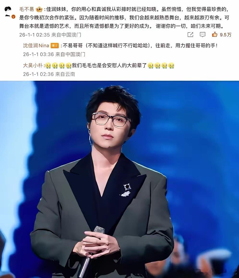 承认吧,多读书就是有用!不信你看毛不易是咋回复沈佳润的,原以为毛不易只是看小沈阳的面子,却不知,他的回复竟然这么有底蕴还温柔!沈佳润跨年唱歌翻车,毛不易这样安慰她:虽然惋惜,但最珍贵的是初次合作的紧张。还说舞台本身就是遗憾的艺术,祝小孩未来可期!这话一出来,很多人都逐字逐句分析了。有网友说,看见了吗?毛不易肯定背着我们看了很多书!从前他发言都说不出几个字,现在这段话,没有一个错别字,没有一个多余的字,正确使用标点符号,还使用了非暴力沟通法:讲事实-讲感受-说原因-提要求。怪不得毛不易经常随身带着电子书呢,合着他不光是立人设,还是读书读出效果来了!内娱男明星们还是多读点儿书吧,因为看看毛不易就知道了,实在是太圈粉啦!热点观点华俊竹有话说