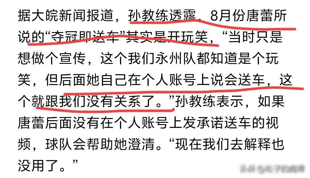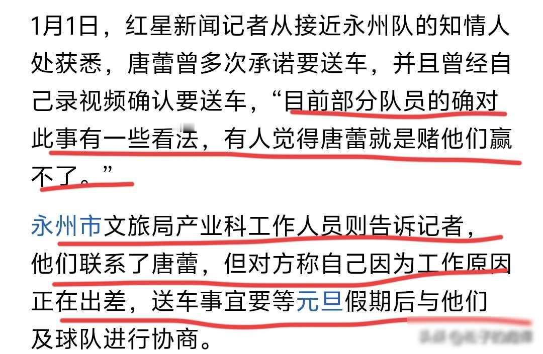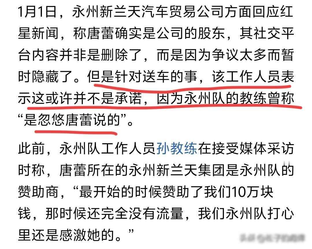 “送车”承诺反转!永州女老板被全网“逼单”,谁的错? 2026年1月1号,红星新闻再次报道永州那起送车事件,事情从去年八月就已经开始,汽贸公司股东唐蕾平时喜欢在短视频平台发内容图个热闹,当时她拍视频说如果永州队拿到冠军就送每人一辆车,这话听起来像开玩笑,她的团队后来也承认那是配合教练做的一个蹭流量段子。 可问题就出在这里,永州队一直打到决赛,最后还拿了冠军,网友就不愿意了,每天刷屏追问送车的事,唐蕾没有解释清楚,反而继续录了好几个视频,反复说一定会送车,粉丝数量一下子增加了三倍多,这下大家真的相信了,觉得这已经不是玩笑,而是实实在在的承诺,唐蕾自己也没意识到,话一说出口,就成了公众心里认定的约定。 12月31号球队夺冠那天,唐蕾把所有相关视频都藏起来,账号也不更新了,网上立刻炸开锅,有人说唐蕾跑路了,公司赶紧出来澄清,说只是暂时隐藏,不是删掉,教练也站出来讲,当初那话确实是两人一起编的段子,但唐蕾后面自己加戏,越说越真,连教练都没想到会这样。 有队员私下里讲,我们这些人不是真想要那辆车,就是想听个说法,这话说得实在,大家心里在意的不是车值多少钱,是这个小人物逆袭的故事能不能有个体面的结尾,唐蕾一个县城老板,靠着短视频火起来,现在却被自己说过的话绑住了手脚,她没有违法,但碰到了中国人最在乎的那个理——说话要算数。 永州文旅已经介入这件事,唐蕾本人现在外地,她打算元旦后坐下来谈,内部消息说公司想用现金加上购车券来代替送车,这样成本更低,操作也更方便,但很多网友并不接受这种做法,觉得这是在糊弄人,现在已经不是送不送车的问题了,而是短视频时代普通人无心的一句话,怎么就突然变成了一种社会压力。 我其实觉得唐蕾一开始没有想得那么复杂,她只是低估了网络传播的力量,又高估了自己能控制事情发展的能力,现在大家关注她并不是因为那辆车的事,而是因为她代表了一种“普通人也能成功”的想象,好像说一句话就能改变人生,结果现实的压力让她难以承受。