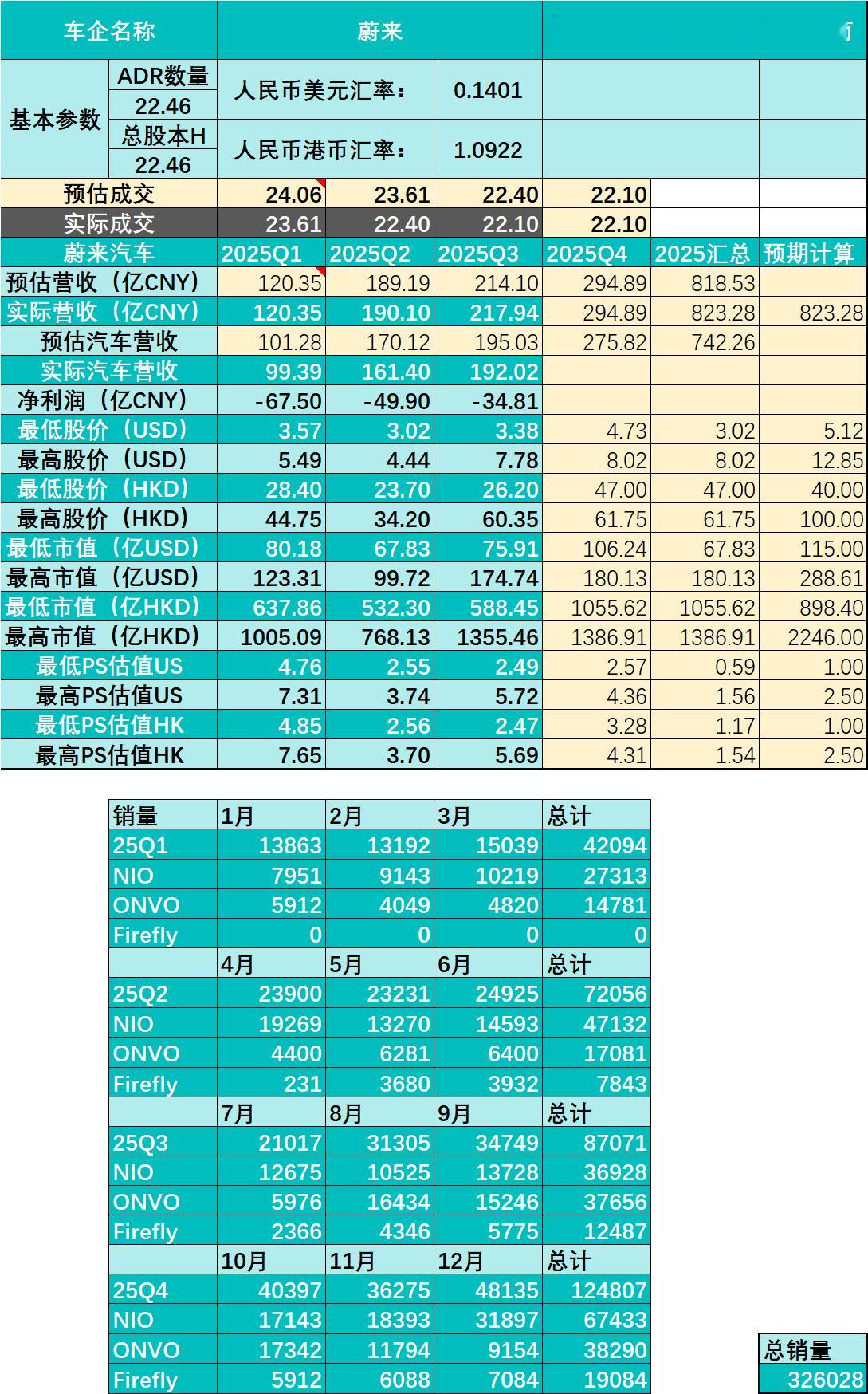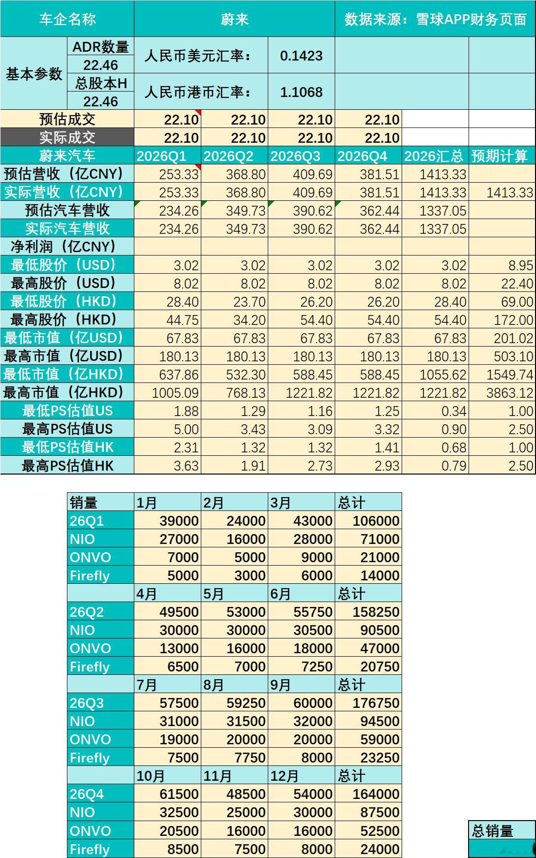 蔚来2026年预测大调整:2026年销量能否突破60万大关?60万销量能不能让盈利板上钉钉?蔚来2025年车企的全年销量出来了,做一个追踪和分析:12月最让人意外的就是蔚来ES8的销量,原本预计交付个1.6万-1.7万台,但实际上交付了超过2.2万台,考虑到ES8这台车目前订单储备非常多,所以2.2万台虽然有冲刺的成分,但在后续的几个月里,很有可能会维持2万台/月的交付量。为什么这么判断呢?因为12月31日当天下单的一个人告诉我,当天下单的需要等到2026年5月才能交付,如果考虑到ES8在12月能交付出2.2万台以上,那么至少现在有10万台订单是可能的。加上其他车型,蔚来品牌交付31897台,是超过预期的,这意味着Q4季度盈利仍有机会实现。毕竟蔚来品牌毛利高,按照正常的财务模型,多卖一台ES8肯定要比多卖一台L90强。原本期待更高的乐道,12月交付和当初11月的预测一样是“不及预期”,没有达到月交付2.5万的目标,只有9154台。乐道的成绩我觉得大家也不用担心,我特意问了一个提了L90的蔚来车主,他表示如果早就知道ES8的价格和配置,那肯定不会提L90,因为ES8的价格和配置实在是太有吸引力了。所以是ES8太强了,而不是L90不行了。第三品牌萤火虫交付远超预期,12月达到了7084台,这台精品小车正在在“现象级爆款”的路上冲刺。萤火虫的现象级爆款,让我决定放弃ES8,改提了2台虫子,后续会和大家详细聊聊。现在2025年的数据都齐了,也是时候做对2026年的预测进行调整。因为ES8和萤火虫的超预期交付量,所以我大幅上调了蔚来品牌和萤火虫品牌在2026年的交付预测,同时对于乐道品牌的交付预测,进行了下调。具体来说:2026年1月:ES8预计可以继续交付22000台左右,剩余5000台为其他车型。考虑到12月的表现,乐道订单可能没有那么多储备,所以按照7000算;萤火虫应该比较稳定一点,但也需要保守估计,给了5000台,7000应该有年底冲量的原因。2026年2月:预计春节要掉1/4产能和交付,所以预计为15000台ES8+1000台别的蔚来车型。乐道就直接参考去年年初的销量了。2026年3月:参考历史数据,略有反弹,基本正常化,考虑到乐道销量缺乏势能了,预测L80会在当月发布,并在月底抢交付2000台。因为3月份是最合理,最早的新车发布时机,更早要受到春节的影响。2026年4月:乐道L80开始上量交付,所以我预测为13000台左右。2026年5月:到这个时间点,ES8的订单量都是可以保证的。因为每个月交付2万台ES8的话,在叠加这五个月新增订单,到这个月订单应该有盈余,所以ES7的发布和交付可能不会像L80那么着急。这个月预测ES7可能会进行预热活动。L80继续交付上量。2026年6月:官方之前曾经提过计划是Q2发布新车型,所以6月份有可能是ES7的发布+交付。2026年7月:ES7会正式开始上量交付,L80稳定交付。2026年11月:保守预测这个月可能会出现补贴用尽的情况,所以要下调销量。2026年12月:月底会有冲刺,但考虑到补贴可能用尽,所以也仅仅是在11月的基础上略微上调。(注:ES9个人预计对整体销量影响比较小,所以没有专门做预测)基于以上预测的情况下,蔚来2026年年销量可以达到60万台以上,我猜后续也会以这个数量级为目标。在这个交付量下,我相信蔚来是一定可以实现全年盈利的。目前市场对蔚来的估值,我个人判断应该是还没有更新,因为如果按照5美元的估值来反向推算,那么市场会认为蔚来2026年的交付量仍然保持在32-35万台,这是一个不太可能会发生的事情。新能源汽车车圈财报蔚来 NIO[股票]