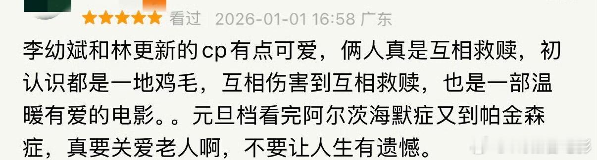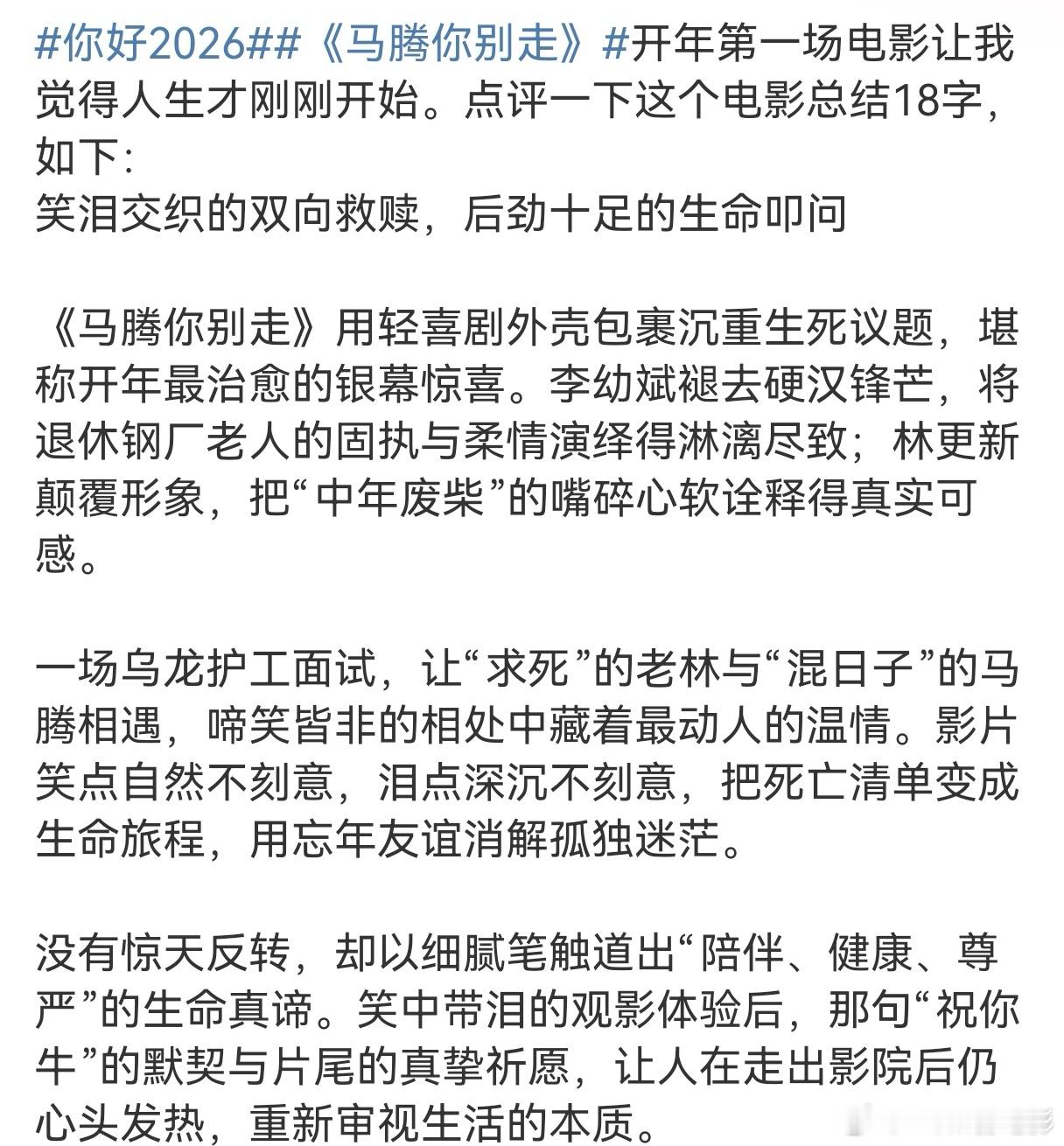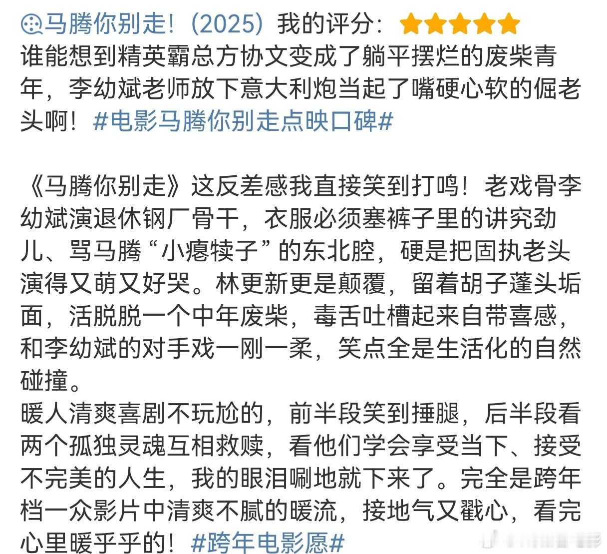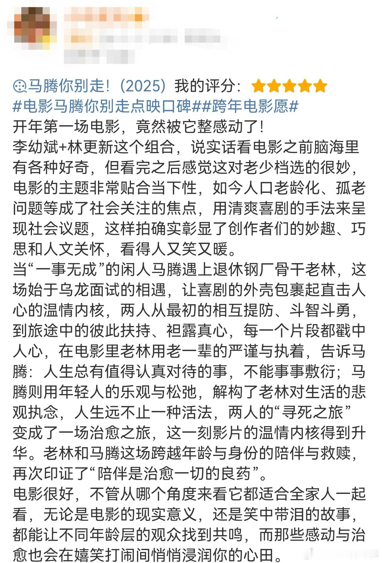 马腾你别走首波口碑《马腾你别走》用马腾和老林两代人的碰撞重塑了我的“养老观”。李幼斌饰演的老林颠覆了我对他“李云龙”的形象认知,老林这个暴脾气却内心脆弱敏感的老人好像自己的长辈亲戚一样熟悉。老林有钱有闲,退休前事业成功,退休后有儿子孝敬的大别墅,面朝大海春暖花开。他这个条件就是我以前最理想的养老状态。所以最开始的我和马腾一样,不理解他的不高兴。而后面一步步走进老林的生活,发现老林的内心需要从未被满足。他想要的其实也很简单,有陪伴,有尊重,有健康。但这些对一个疏于表达的老人来说近乎奢望。直到遇上了不一般的“护工”马腾。马腾的出现是他人生的变数,是老林没接触过的全新人生。马腾改变了老林的养老生活和看待生命意义的方式,迎来了不小的改变,所以啊,老林真的是我最羡慕的养老状态!不仅有钱有闲,还愿意接受新鲜变化,从被自我困住的内心之中迸发新生,带着依然勇敢的心态去面对未来的生活。在辞旧迎新之际,看这部《马腾你别走》再合适不过了。年逾七十的老林依然能勇敢的拓宽生命的边际,我们的2026也一定会无限的变化和可能!电影马腾你别走跨年电影愿马腾你别走!(2025) 我的评分: