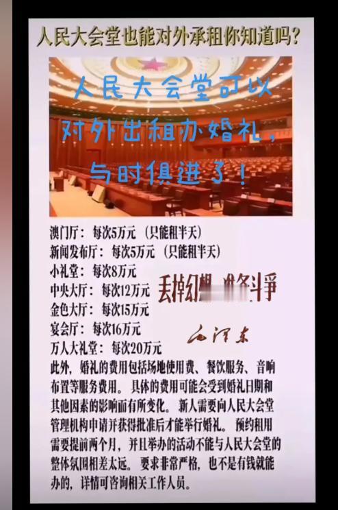 很多人都不知道,人民大会堂现在是对咱们普通老百姓开放了。 部分厅室是可以对外租赁的,可以租赁用来举办婚礼、谢师宴、新书发布会等等。以前,德云社就租赁过大会堂的厅室举办了一次相声专场。 就有人会疑惑了,这么庄严的地方,为啥要对外租赁从事商业活动呢? 六七十年代的时候,人民大会堂是不对外开放的。 那时候,大会堂只对少数人发放参观劵。 而能获得参观劵的人,一般都是劳模或者是行业标兵这样的人。 但是呢,大会堂自打1959年投入使用以来,每年的各种维护费用再加上人员的开支等等,每年费用都要高达上百万元。 这无疑是一个沉重的经济包袱啊! 而且,每年就那么一个来月的时间用来召开会议,很多时候都是闲置着的。 况且,明明就叫“人民大会堂”,要是不对人民开放,还能叫这个名字嘛。 于是乎,七十年代末的时候,大会堂就开始尝试走商业化道路了。 不到三年的时间,大会堂就完全做到了自给自足,完全不需要依赖国家的财政来养着了。 现在,咱们普通老百姓都能花钱租赁大会堂的部分厅室,这不挺好的嘛。 只不过,审核的程序是很严格的,只要通过了审核,就能租赁了。 说真的,要是能在这个地方举办自己的婚礼,想想都很有纪念意义呢。