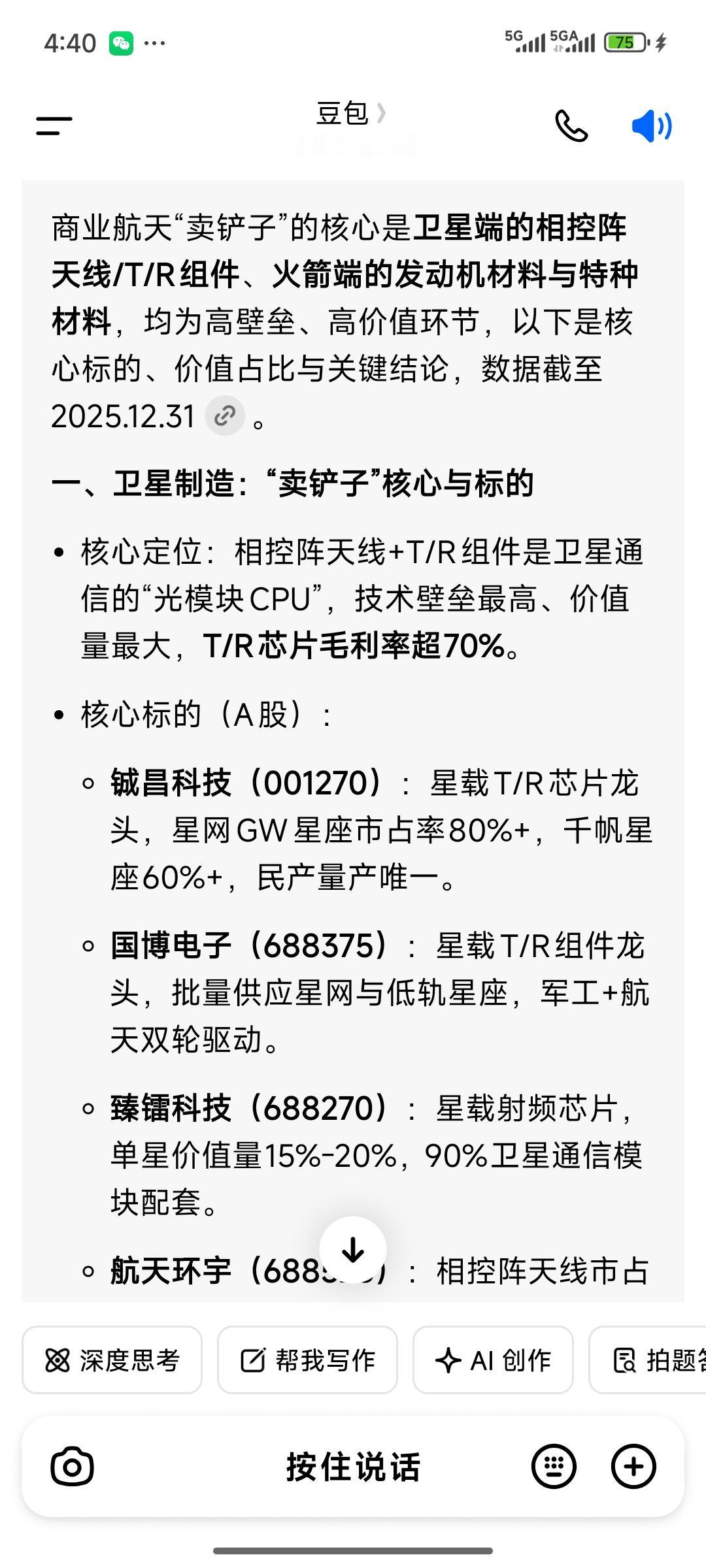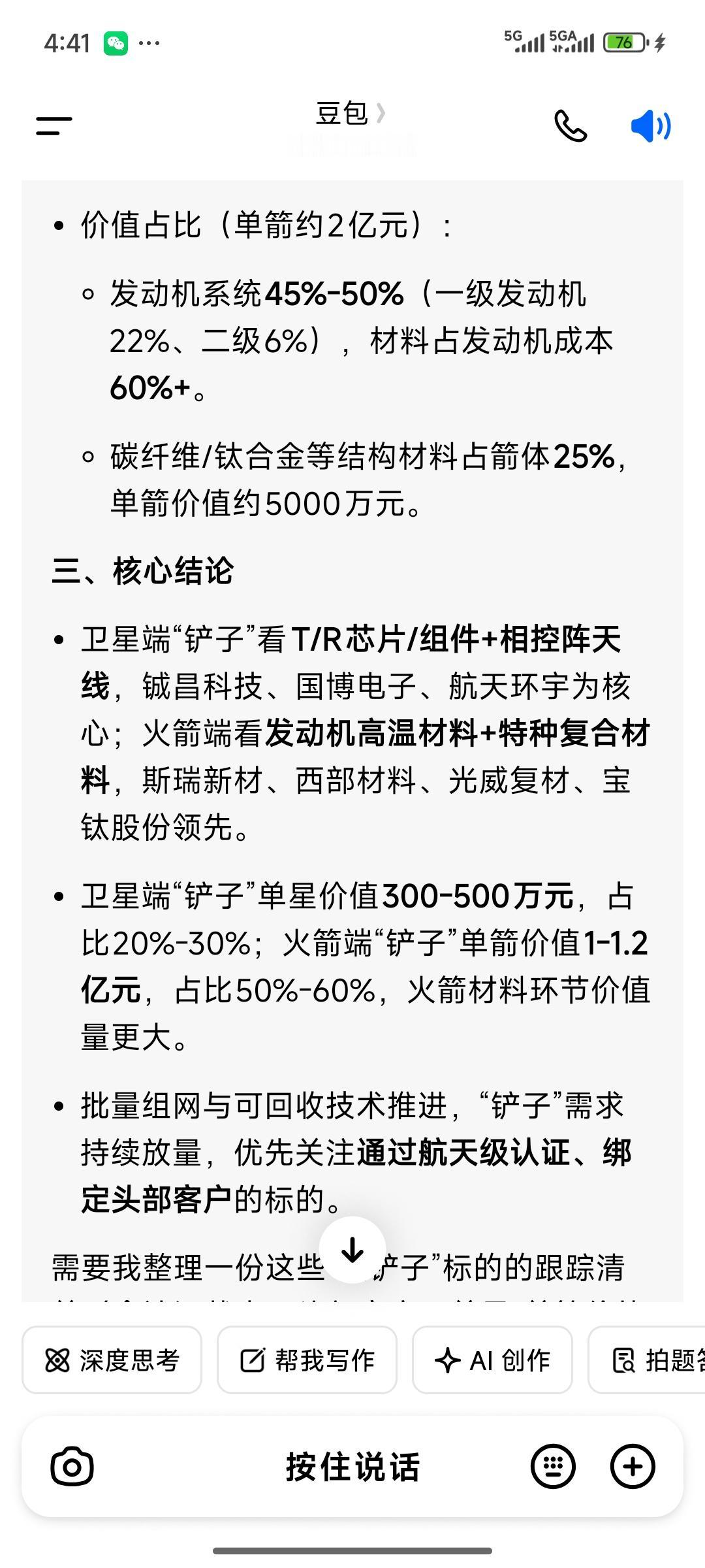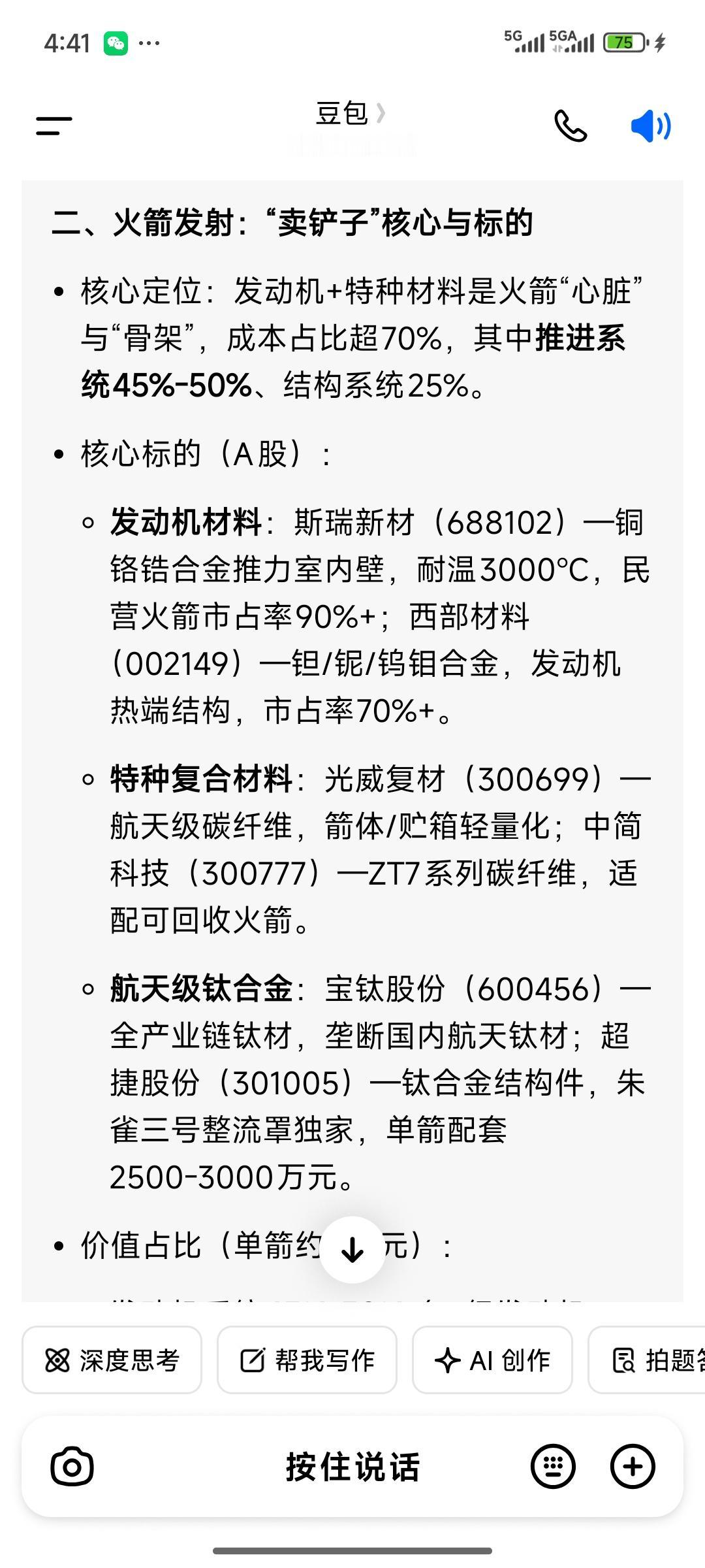 这个周末催化力度最强、消息最为密集、讨论最为热烈的,当属商业航天、航空航天领域,目前它的热度可谓是居高不下。 围绕商业航天的整个体系,一方面是从卫星制造到火箭发射,还涉及维护、回收、管理等一系列环节,形成一个完整的闭环。 我们知道,无论是做机器人,还是此前的新能源领域,实际上最受益的板块是 Cpo板块板块涌现出了新易盛,易胜天这样的一个概念。那么在商业航天领域,那些“卖铲子”业务的核心标的有哪些呢?我特意咨询了豆包,豆包为我们罗列了以下几个。我认为这些是接下来我们应重点关注的对象。 它们是从卫星端、火箭端这两大方面挖掘出的“卖铲子”股票。我们应紧密跟踪这几类核心股票,逢低买入。由于该领域已经炒作了一段时间,我们很难拿到很低价位的筹码了,所以秉持逢低买入的原则,看看能否参与一波行情。 航空航天板块 航天概念股 中国商业航天 航天产业 航天产业链 航天经济 商业与航天