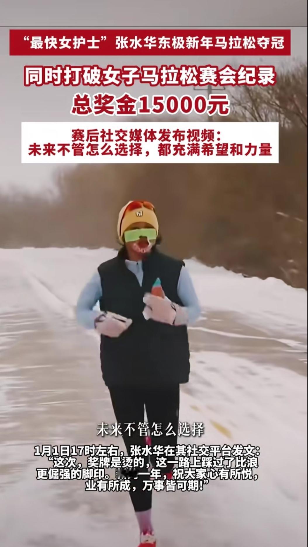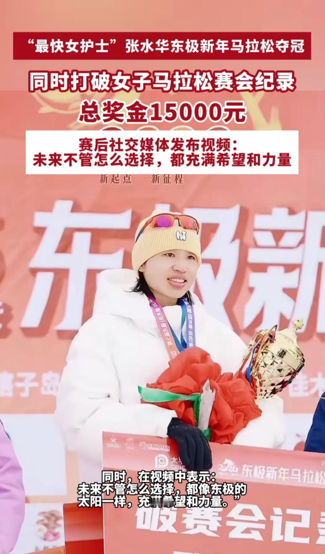 你敢信吗?2026年元旦东极抚远新年马拉松,拿下女子全马冠军的不是职业运动员,而是每天穿护士服扎进病房的张水华!她甩开对手冲线时超飒,可这份荣耀背后,藏着太多不为人知的坚持。 作为临床护士,她的日常是连轴转的夜班、停不下来的查房,连吃饭都得掐着点。别人下班躺平刷剧,她却换上跑鞋扎进夜色——不是为了拿奖,只是想在奔跑中释放工作压力,更想以健康的状态守着病床上的患者。 之前她还因“调休跑马”被热议,索性清空社交账号沉下心,一边把护理工作做到细致,一边挤时间练跑步,2025年哈尔滨马拉松就跑出过2小时35分27秒的好成绩。 这次夺冠后她说“想给患者传递力量”,突然就懂了:所谓闪光,从不是天生厉害,而是把日子里的每份坚守,都活成了自己的勋章。 生活从不会亏待认真奔跑的人,不管是病房里的守护,还是赛道上的冲刺,每一份不放弃都该被看见。