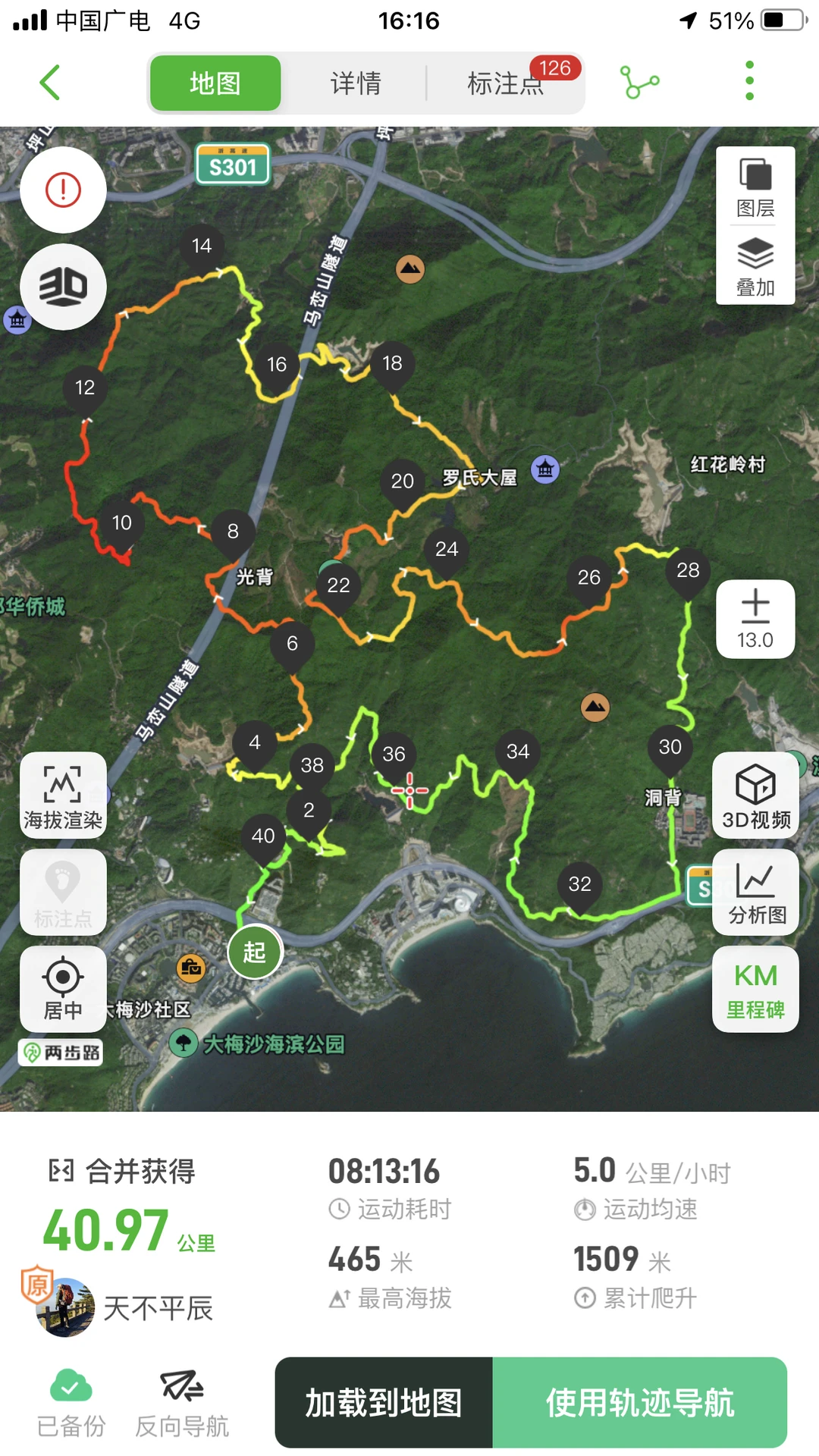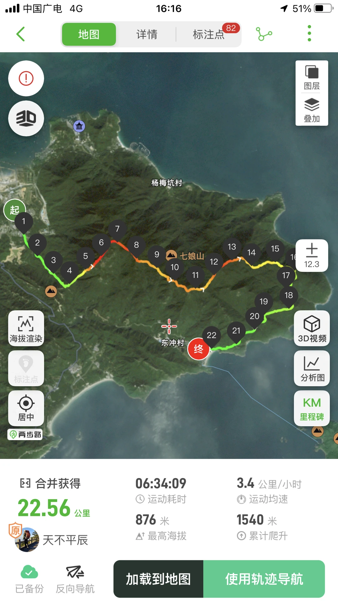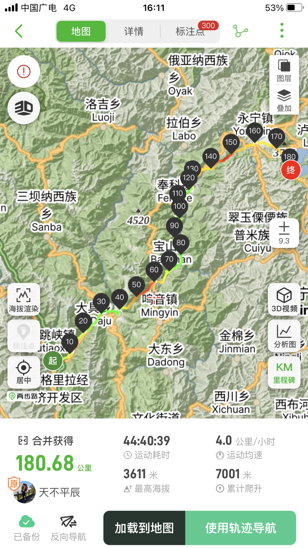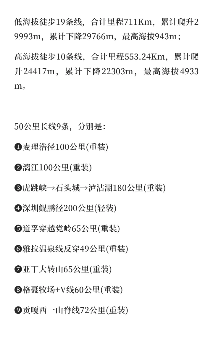低海拔徒步19条线,合计里程711Km,累计爬升29993m,累计下降29766m,最高海拔943m;