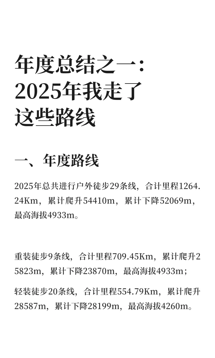 2025年总共进行户外徒步29条线,合计里程1264.24Km,累计爬升54410m,累计下降52069m,最高海拔4933m。