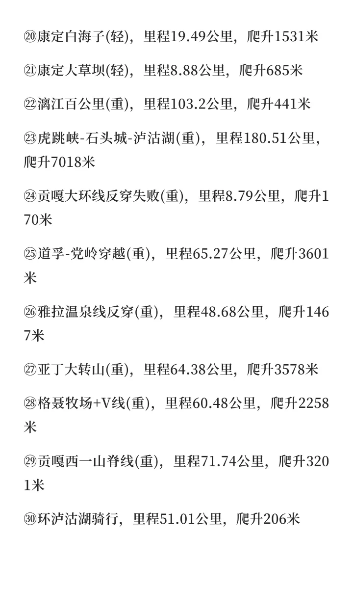 轻装徒步20条线,合计里程554.79Km,累计爬升28587m,累计下降28199m,最高海拔4260m。