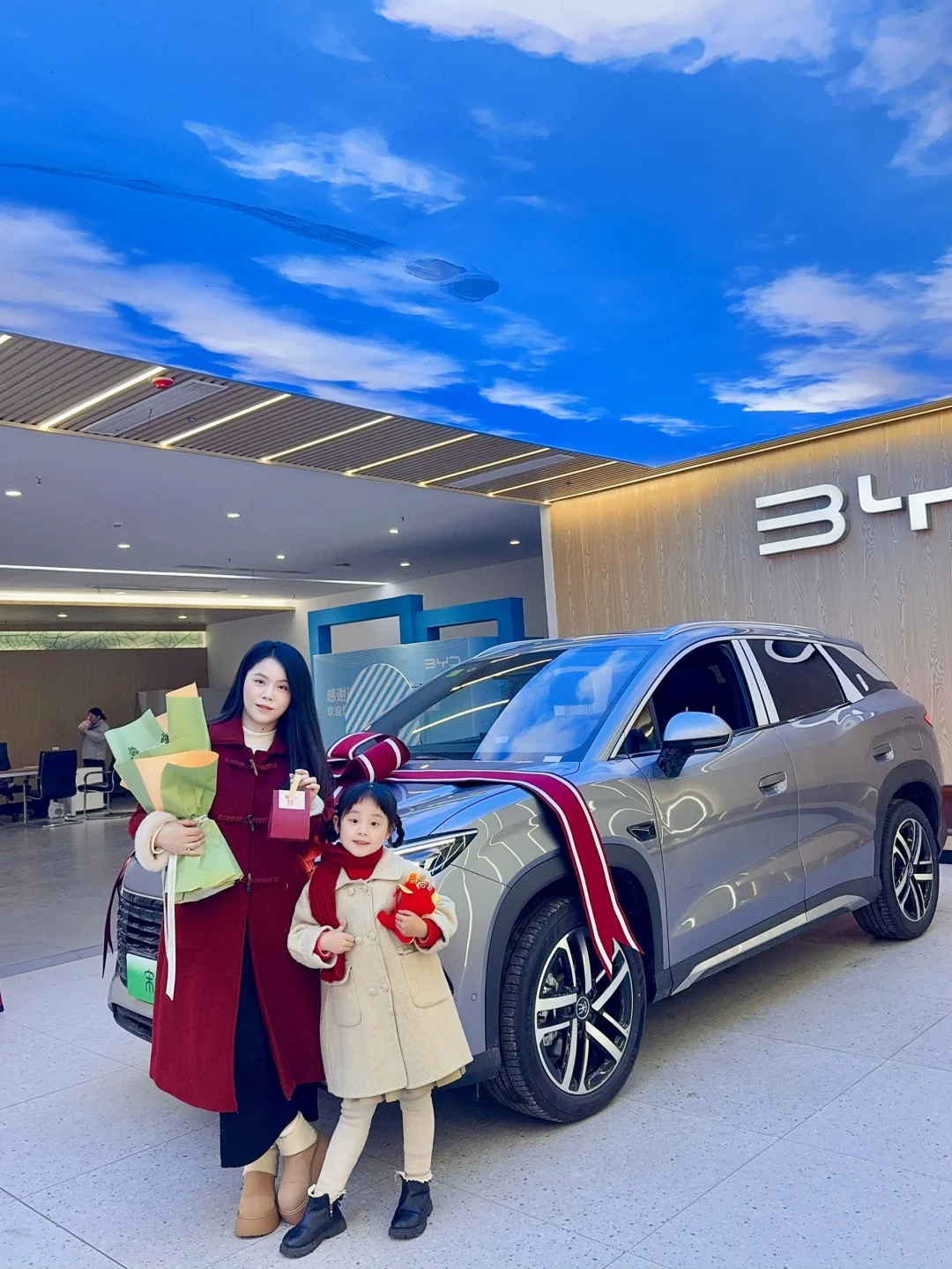 一眼就看到了那辆挂着大红花的新车宋L DM-i,小家伙当场就蹦蹦跳跳着“妈妈,就要这个!”